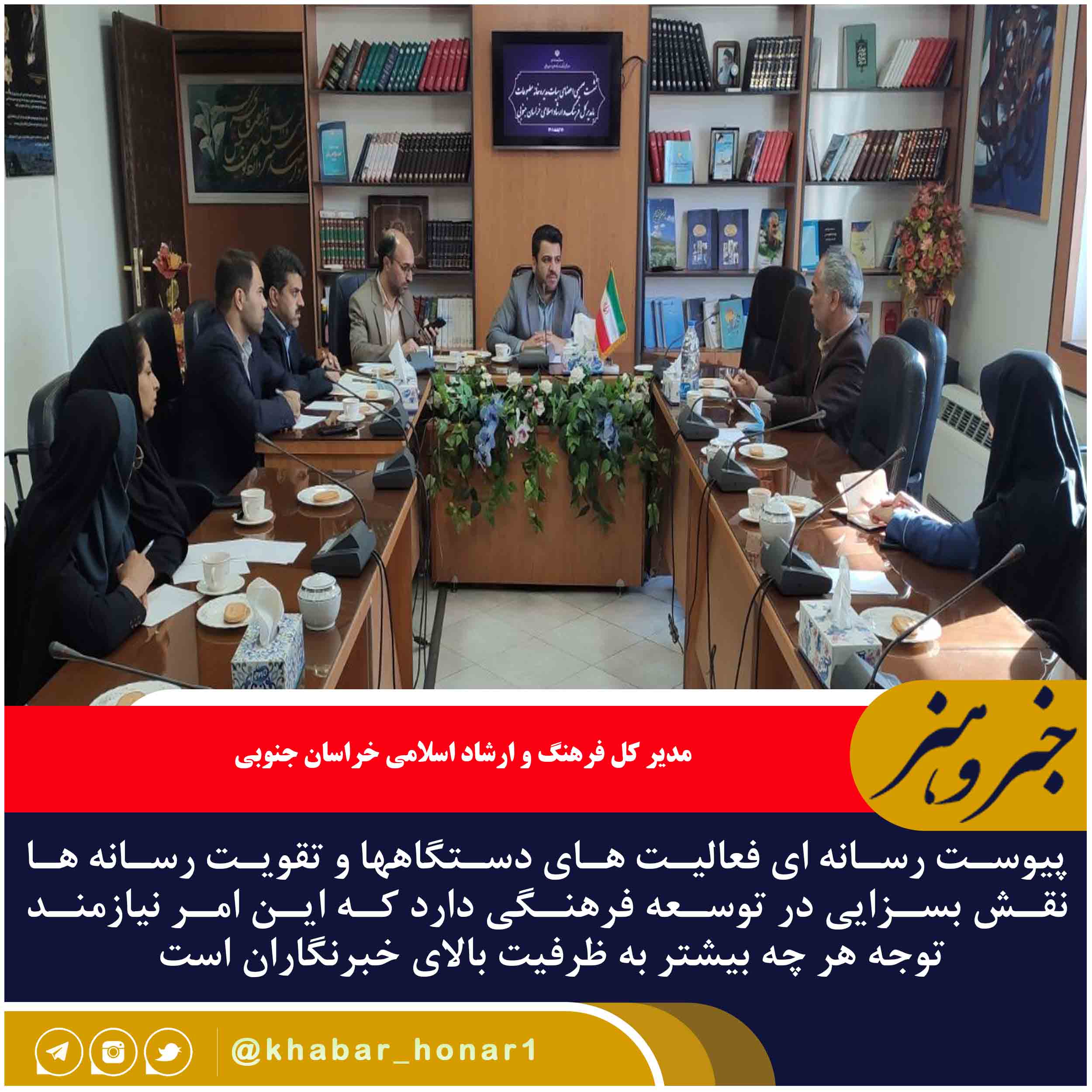مدیر کل فرهنگ و ارشاد اسلامی خراسان جنوبی در نشست صمیمی با اعضای هیئت مدیره خانه مطبوعات با بیان اینکه باید نگاه مسئولان به اهمیت پیوست رسانه ای فعالیت ها تقویت شود، گفت: پیوست رسانه ای فعالیت دستگاهها و تقویت رسانه ها نقش بسزایی در توسعه فرهنگی دارد که این امر نیازمند توجه هر چه بیشتر به ظرفیت بالای خبرنگاران است.؛ علی فرخنده در نشست صمیمی با اعضای هیئت مدیره خانه مطبوعات خراسان جنوبی با بیان اینکه در مجموعه فرهنگ و ارشاد اسلامی به دنبال ارتقای کیفی و سطح کمی رسانه ها هستیم؛ افزود: افزایش سطح پایگاههای خبری، کیفی سازی و توانمند سازی ظرفیت خبرنگاران مورد توجه جدی قرار دارد.