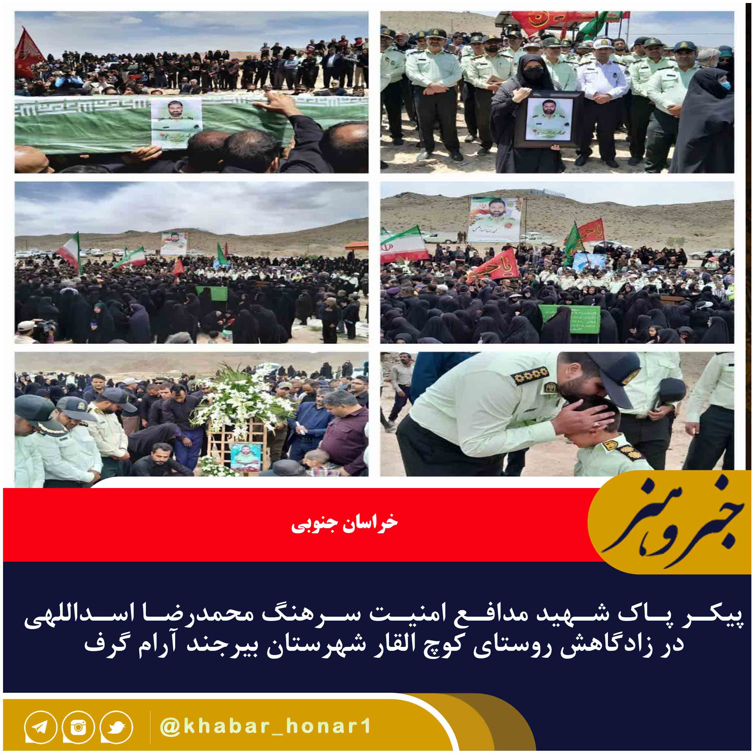 پیکر پاک شهید مدافع امنیت سرهنگ محمدرضا اسداللهی پس از تشییع در شهر بیرجند و با حضور پرشور مردم شهید پرور خراسان جنوبی در زادگاهش روستای کوچ القار شهرستان بیرجند آرام گرفت
