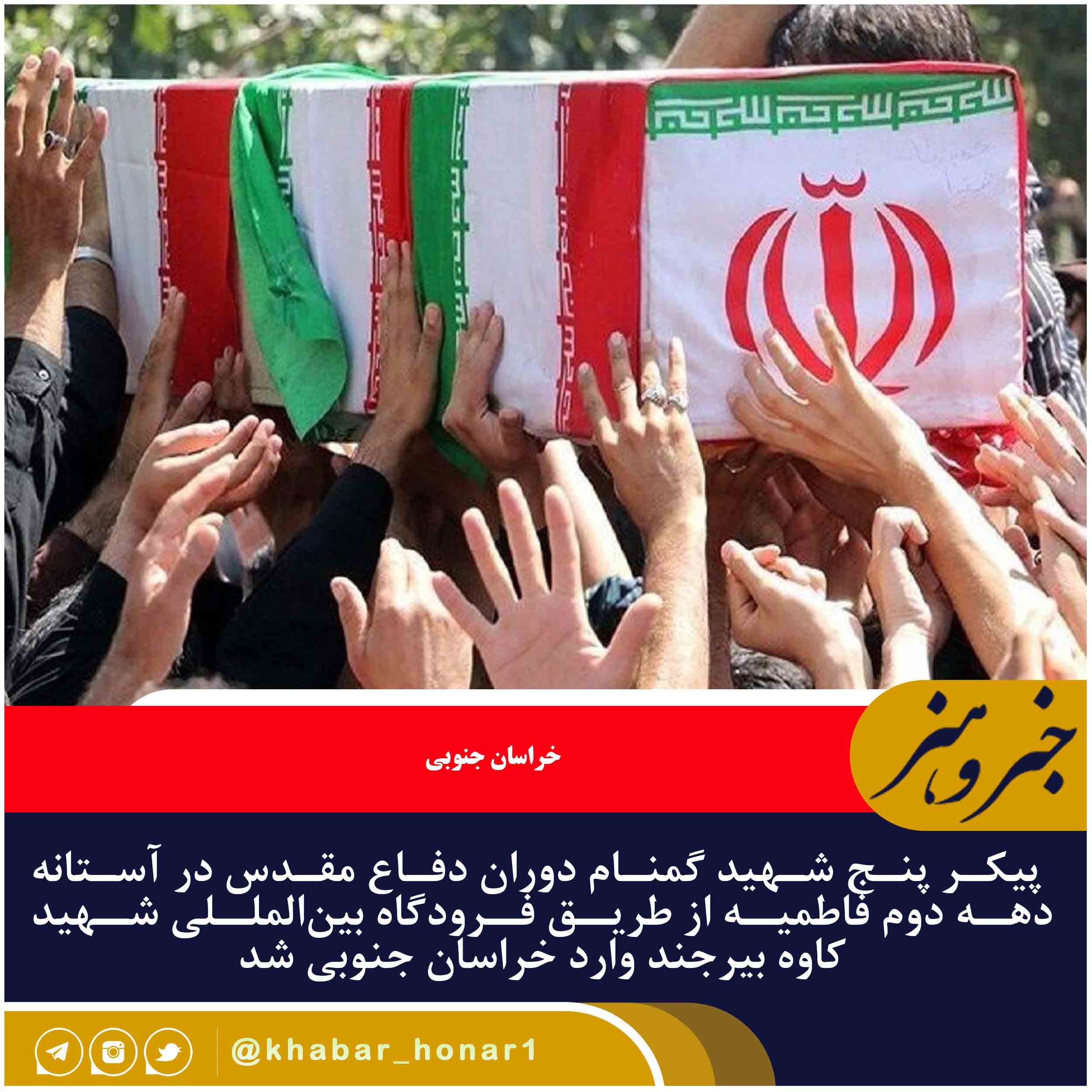 پیکر پنج شهید گمنام دوران دفاع مقدس در آستانه دهه دوم فاطمیه از طریق فرودگاه بینالمللی شهید کاوه بیرجند وارد خراسان جنوبی شد.