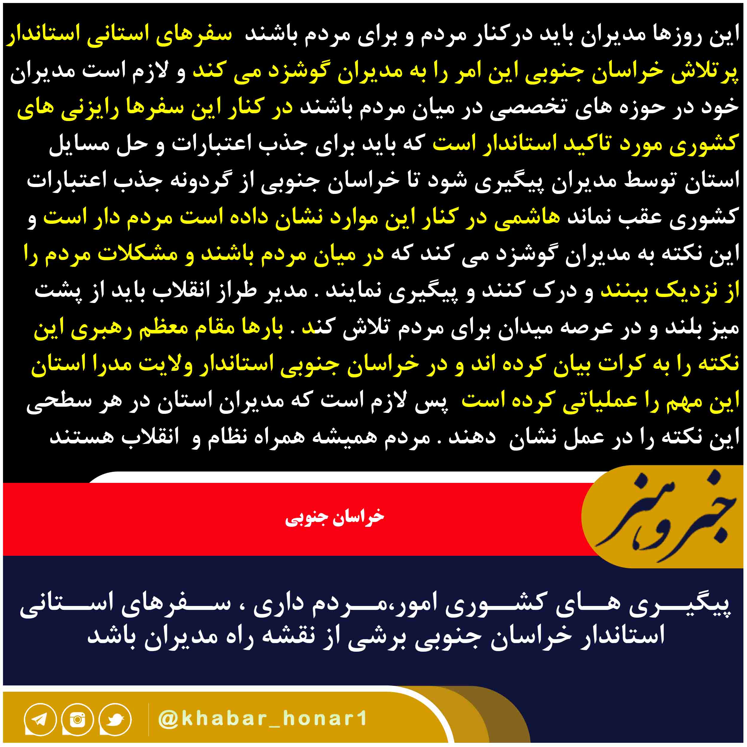 این روزها مدیران باید درکنار مردم و برای مردم باشند سفرهای استانی استاندار پرتلاش خراسان جنوبی این امر را به مدیران گوشزد می کند و لازم است مدیران خود در حوزه های تخصصی در میان مردم باشند در کنار این سفرها رایزنی های کشوری مورد تاکید استاندار است که باید برای جذب اعتبارات و حل مسایل استان توسط مدیران پیگیری شود تا خراسان جنوبی از گردونه جذب اعتبارات کشوری عقب نماند هاشمی در کنار این موارد نشان داده است مردم دار است و این نکته به مدیران گوشزد می کند که در میان مردم باشند و مشکلات مردم را از نزدیک ببنند و درک کنند و پیگیری نمایند . مدیر طراز انقلاب باید از پشت میز بلند و در عرصه میدان برای مردم تلاش کند . بارها مقام معظم رهبری این نکته را به کرات بیان کرده اند و در خراسان جنوبی استاندار ولایت مدرا استان این مهم را عملیاتی کرده است پس لازم است که مدیران استان در هر سطحی این نکته را در عمل نشان دهند . مردم همیشه همراه نظام و انقلاب هستند