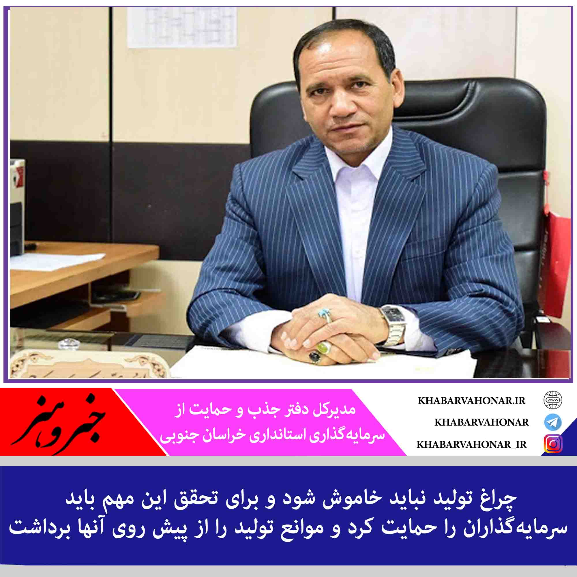 مدیرکل دفتر جذب و حمایت از سرمایهگذاری استانداری خراسان جنوبی گفت: چراغ تولید در بشرویه نباید خاموش شود و برای تحقق این مهم باید سرمایهگذاران را حمایت کرد و موانع تولید را از پیش روی آنها برداشت.