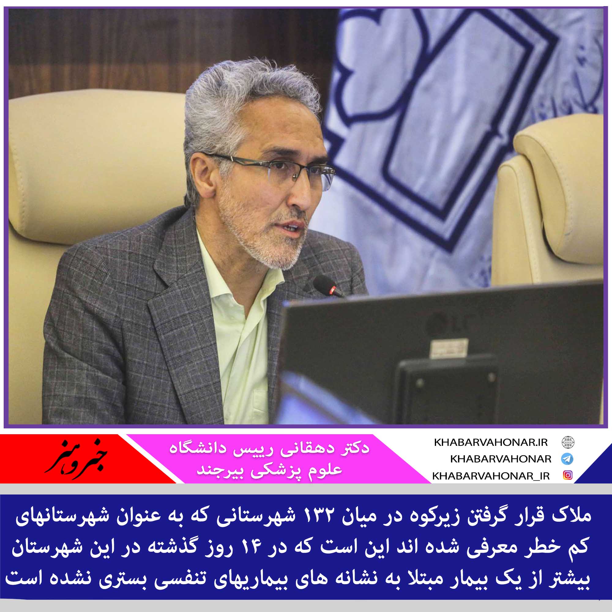 ?دکتر دهقانی رییس دانشگاه علوم پزشکی بیرجند: ملاک قرار گرفتن زیرکوه در میان ۱۳۲ شهرستانی که به عنوان شهرستانهای کم خطر معرفی شده اند این است که در ۱۴ روز گذشته در این شهرستان بیشتر از یک بیمار مبتلا به نشانه های بیماریهای تنفسی بستری نشده است.