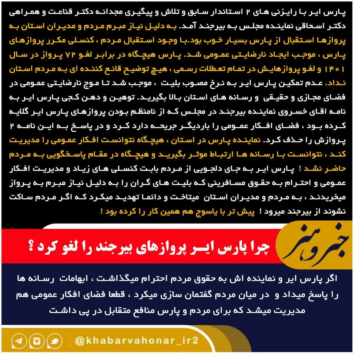 چرا پارس ایـر پروازهای بیرجند را لغو کرد ؟