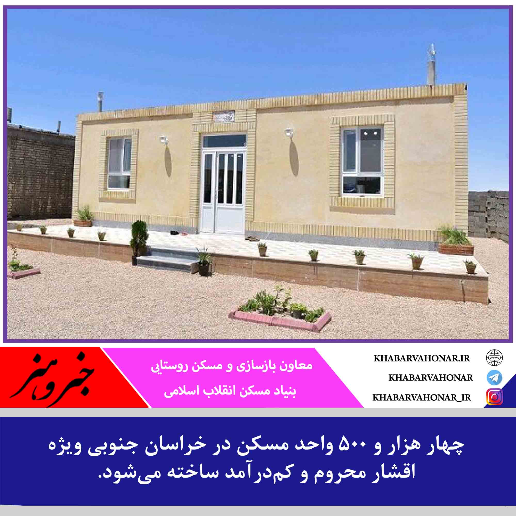 مجید جودی روز دوشنبه در بازدید از روستاها صولابست، توت و ماخونیک شهرستان سربیشه در جمع خبرنگاران اظهار داشت: ساخت چهار هزار و ۵۰۰ واحد در روستاها و شهرهای زیر ۱۰۰ هزار نفر جمعیت خراسان جنوبی به صورت پایلوت تا ۲ هفته آینده آغاز میشود که کمک بلاعوض ۵۰ میلیون تومان از سوی بنیاد مستضعفان و ۱۵ تا ۲۰ میلیون تومان از سوی بنیاد مسکن برای ساخت هر واحد اختصاص داده خواهد شد.