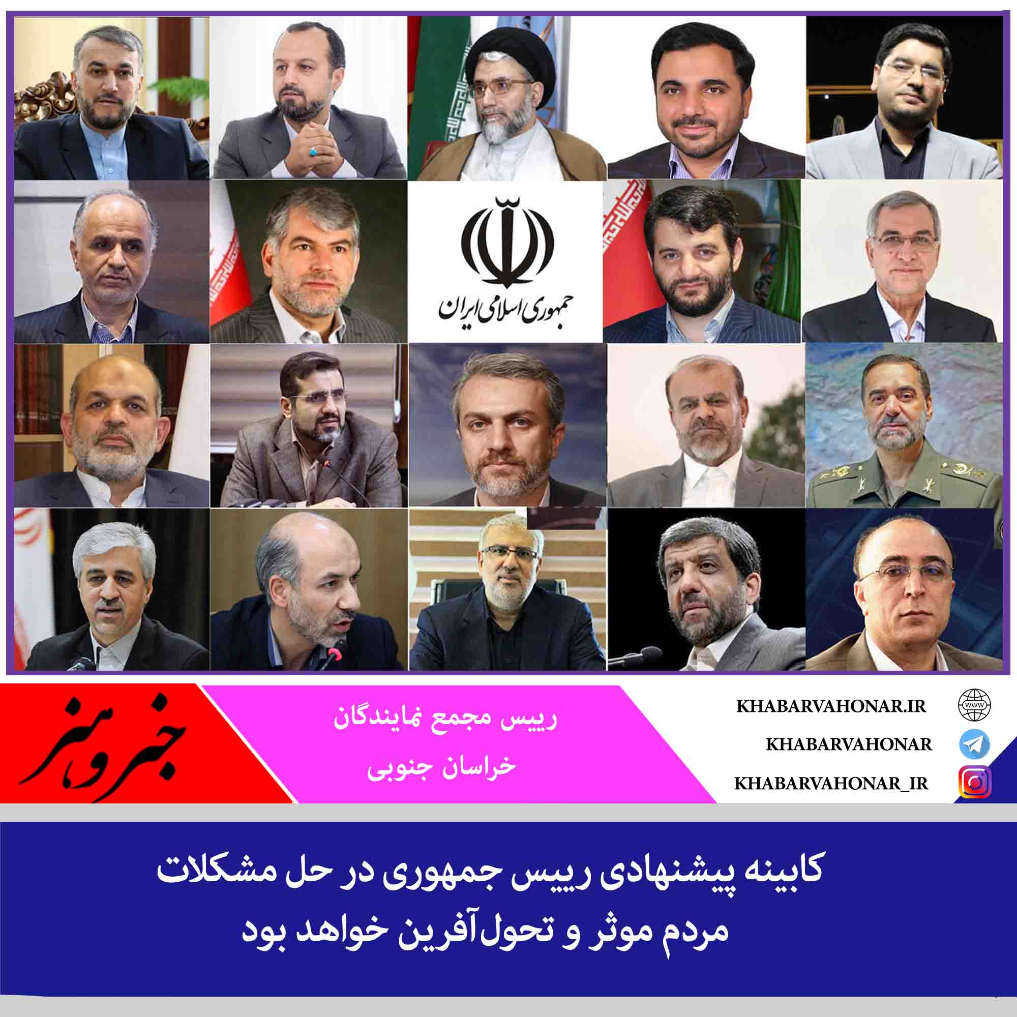 رییس مجمع نمایندگان خراسان جنوبی در مجلس شورای اسلامی گفت: کابینه پیشنهادی رییس جمهوری در حل مشکلات مردم موثر و تحولآفرین خواهد بود.