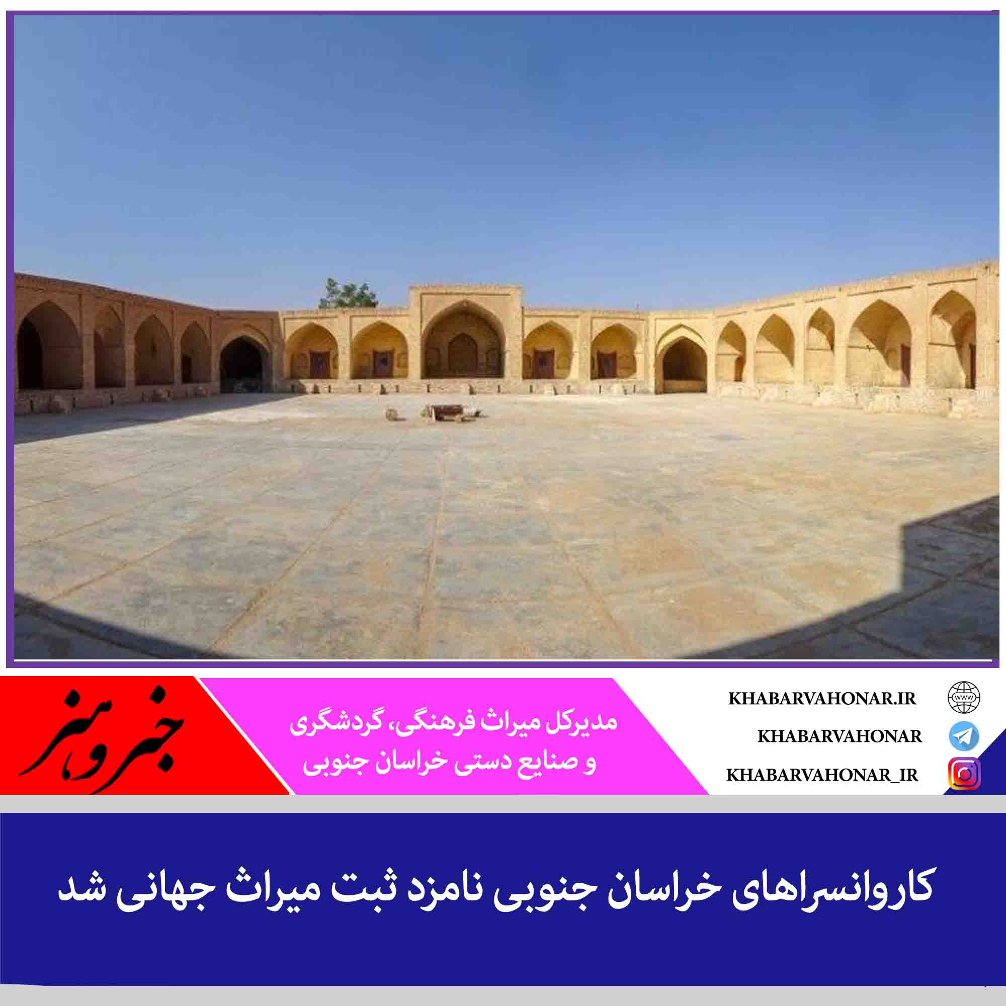 مدیرکل میراث فرهنگی، گردشگری و صنایع دستی خراسان جنوبی گفت: نامزدی کاروانسراهای خراسان جنوبی برای ثبت در فهرست میراث جهانی مورد تایید قرار گرفته است و در سال جدید میلادی به عنوان پنجمین اثر این استان ثبت جهانی می‌شود.