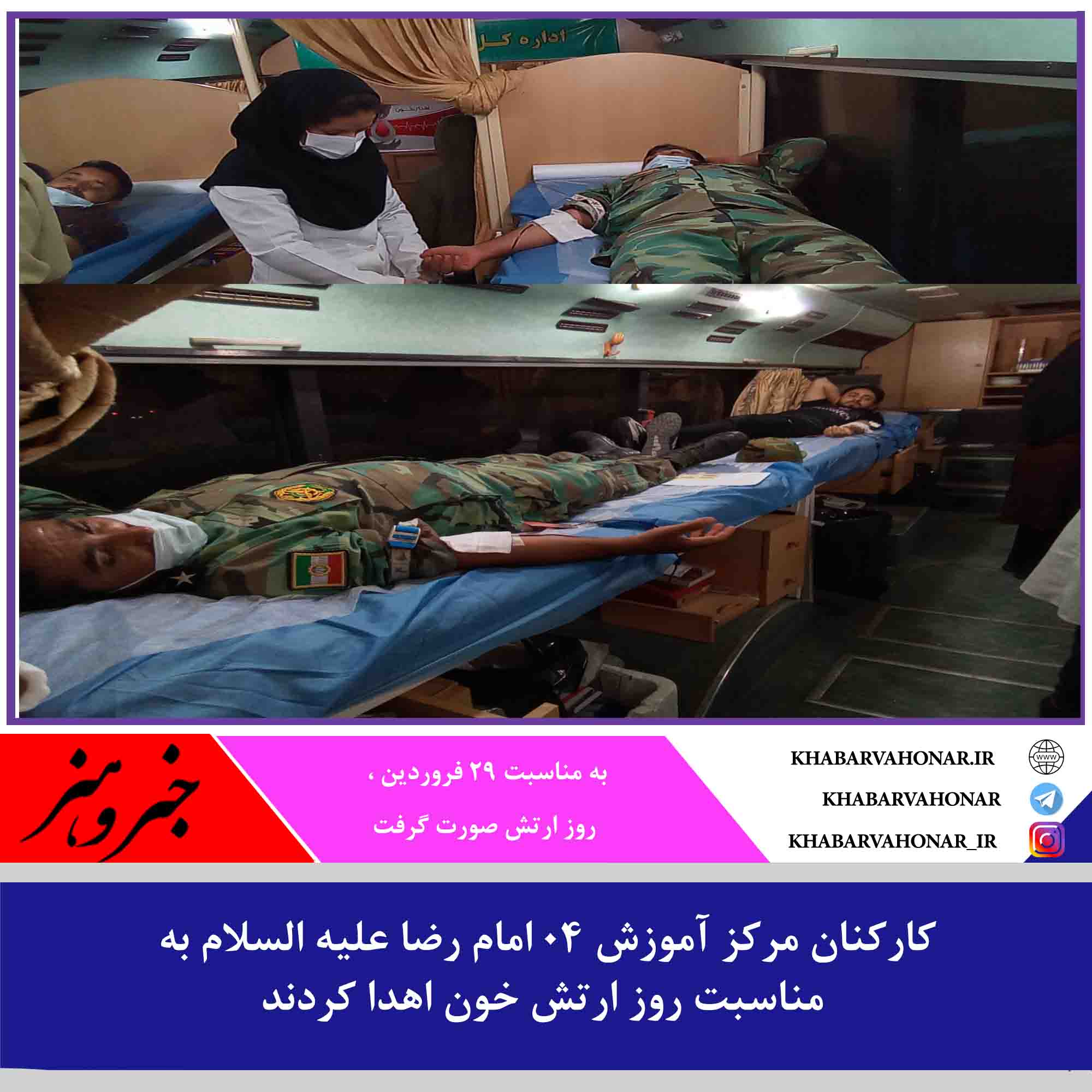 به مناسبت بیست و نهم فروردین ماه روز ارتش جمهوری اسلامی ایران جمعی از کارکنان مرکز آموزش ۰۴ امام رضا علیه السلام در قراری همدلانه و داوطلبانه با حضور در واحد سیار انتقال خون که در کوی سازمانی مهر ولایت مرکز آموزش ۰۴ امام رضا علیه السلام بیرجند مستقر شده بود. خون خود را به بیماران اهدا کردند . این افراد هدف از کارشان را نشان دادن در صحنه بودن همیشگی ارتشی‌ها در شرایط سخت کشور به صورت عام و در این شرایط خاص مقابله با ویروس کرونا عنوان کردند.