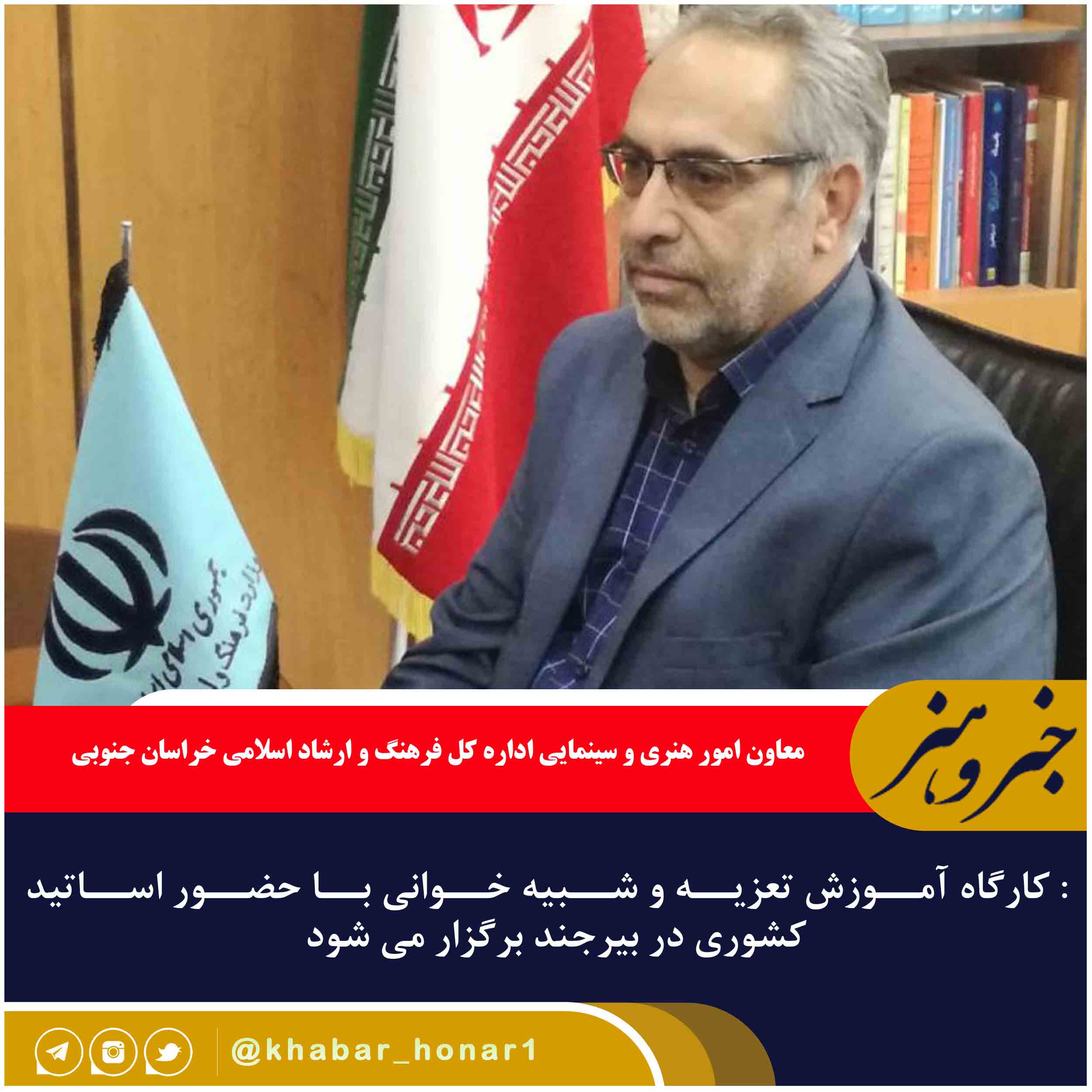 معاون امور هنری و سینمایی اداره کل فرهنگ و ارشاد اسلامی خراسان جنوبی گفت: کارگاه آموزش تعزیه و شبیه خوانی با حضور اساتید کشوری عصر چهارشنبه ۳۰ شهریور ماه جاری در بیرجند برگزار می شود.؛ سید علی زمزم با اشاره به تاثیر مستقیم برنامه های هنری و نمایشی اعم از تعزیه در افکار عمومی بیان کرد: هنر تعزیه در ارتقا فرهنگی به ویژه فرهنگ عاشورا و شهادت بسیار تأثیر گذار بوده که نباید از اهمیت آن غافل شد.