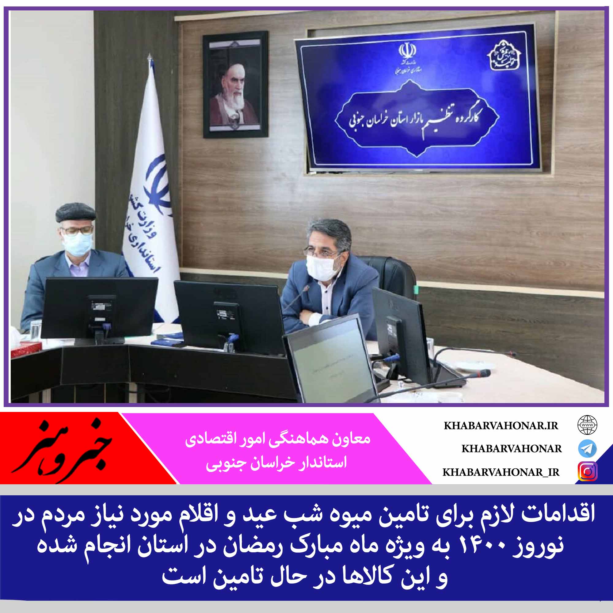 معاون هماهنگی امور اقتصادی استاندار خراسان جنوبی گفت: اقدامات لازم برای تامین میوه شب عید و اقلام مورد نیاز مردم در نوروز ۱۴۰۰ به ویژه ماه مبارک رمضان در استان انجام شده و این کالاها در حال تامین است.