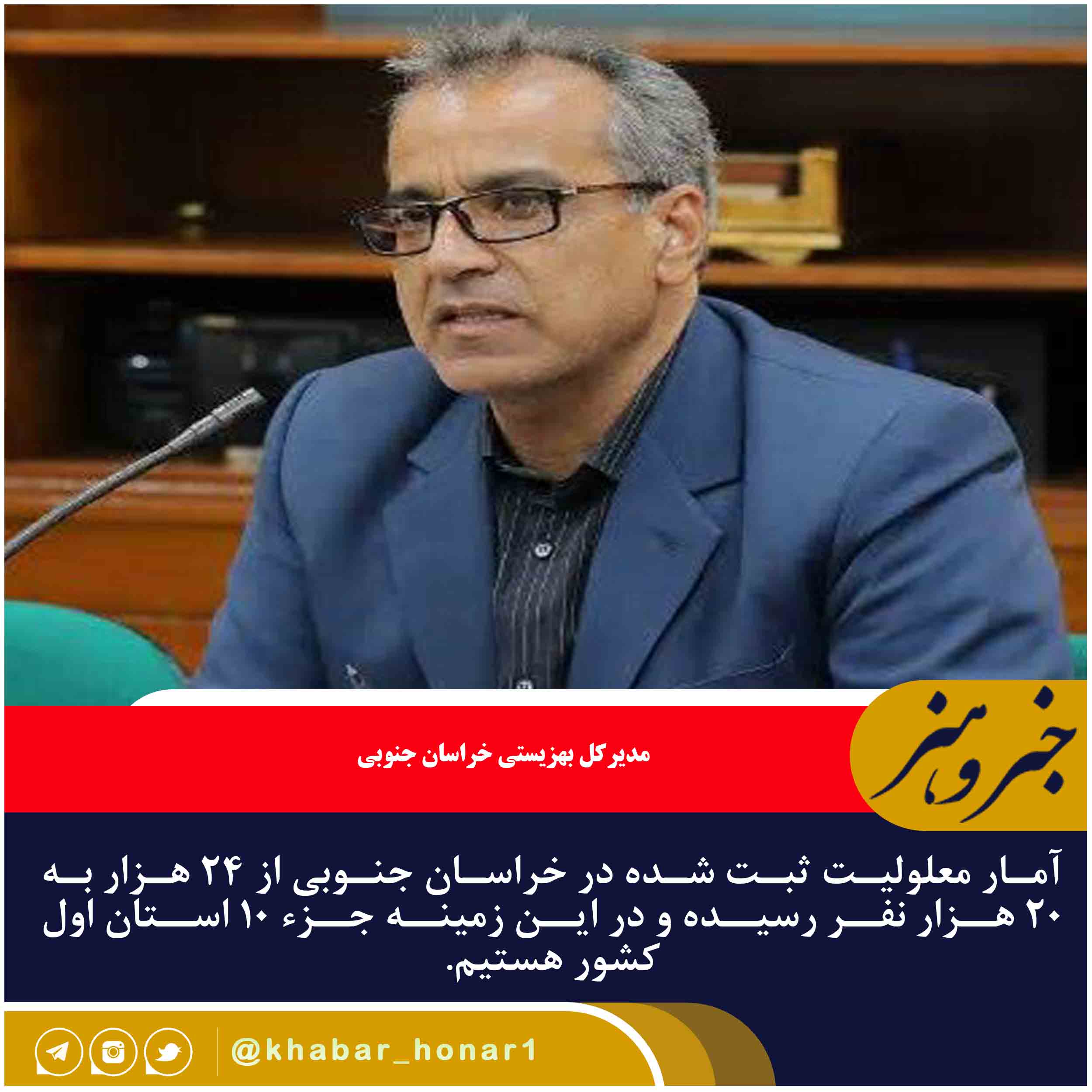 مدیرکل بهزیستی خراسان جنوبی گفت: آمار معلولیت ثبت شده در خراسان جنوبی از ۲۴ هزار به ۲۰ هزار نفر رسیده و در این زمینه جزء ۱۰ استان اول کشور هستیم.