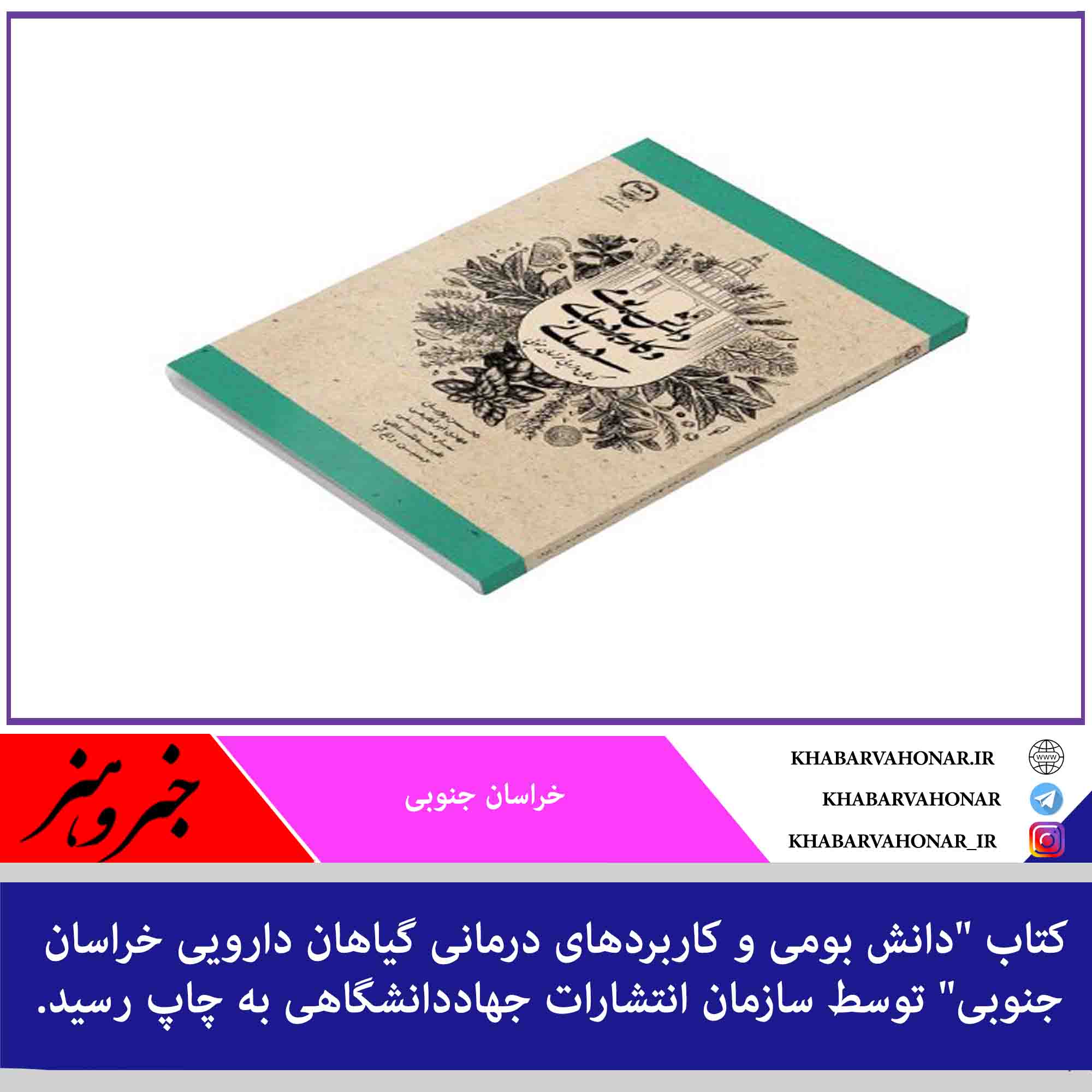 کتاب «دانش بومی و کاربردهای درمانی گیاهان دارویی خراسان جنوبی» تالیف مهندس محسن پویان، دکتر مهدی ابراهیمی، دکتر ساره حسینی، دکتر طیبه شاهی و حسین راغ آرا توسط انتشارات جهاددانشگاهی استان به چاپ رسید.