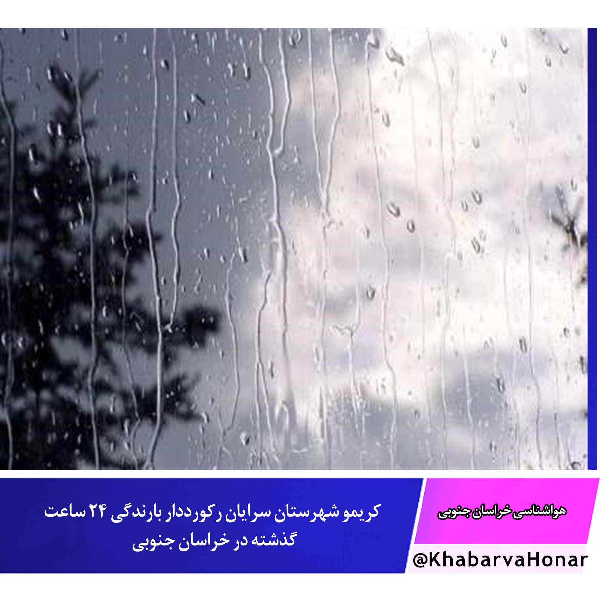 ا به ترتیب در مراکز فتح آباد فردوس ۳۹ میلیمتر، فتح آباد قاین ۳۸ میلیمتر، ابراهیمی نهبندان ۳۷ میلیمتر، باغستان فردوس ۳۶ میلیمتر، سربیشه ۳۳ میلیمتر، آرین شهر قاین ۲۸ میلیمتر، جنوب شهر بیرجند ۲۷ میلیمتر، طاهرآباد فردوس ۲۲ میلیمتر، زهری نهبندان ۲۱ میلیمتر، عباس آباد قاین ۲۳ میلیمتر، آلنگ نهبندان ۲۱ میلیمتر و فردوس ۲۰ میلیمتر بارندگی ثبت شد.