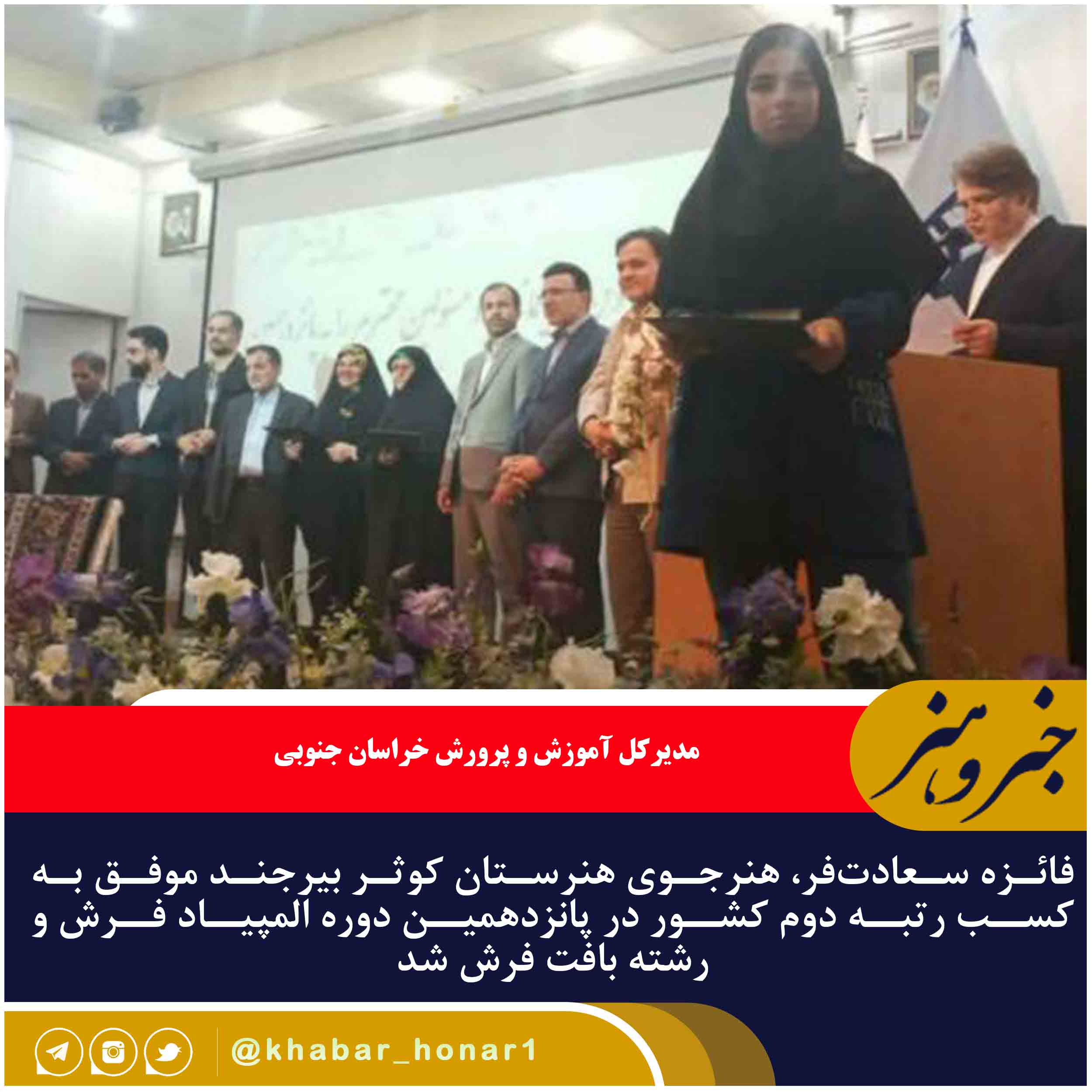 مدیرکل آموزش و پرورش خراسان جنوبی گفت: فائزه سعادتفر، هنرجوی هنرستان کوثر بیرجند موفق به کسب رتبه دوم کشور در پانزدهمین دوره المپیاد فرش و رشته بافت فرش شد.