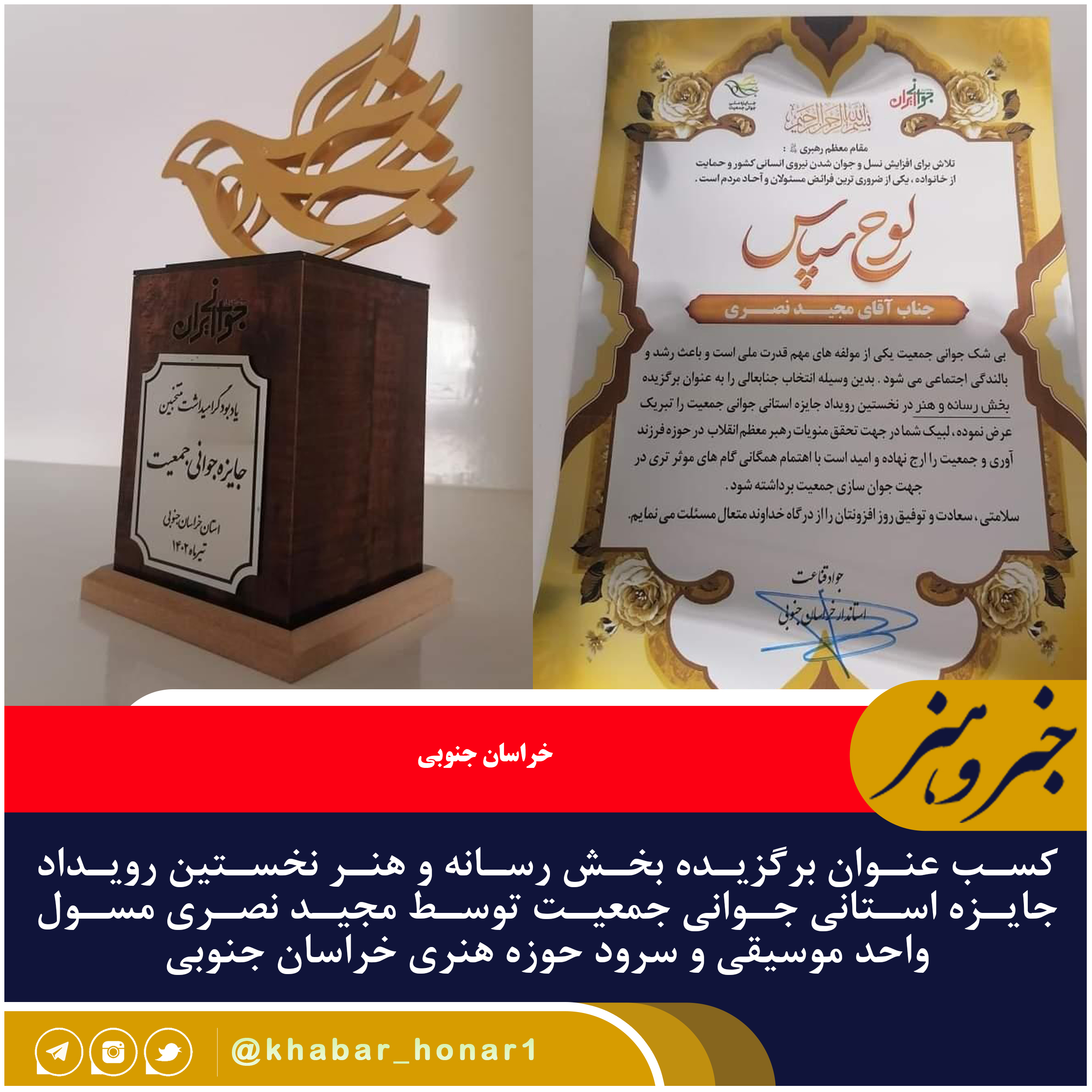 کسب عنوان برگزیده بخش رسانه و هنر نخستین رویداد جایزه استانی جوانی جمعیت توسط مجید نصری مسول واحد موسیقی و سرود حوزه هنری خراسان جنوبی با اثر فرشته کوچک تولیدی حوزه هنری خراسان جنوبی و اجرای گروه نصر شهرستان بشرویه عوامل این اثر هنری عبارتند از شاعر قاسم صرافان. اهنگسازی، تنظیم، میکس و مسترینگ مجید نصری، ضبط استودیو حوزه هنری خراسان جنوبی. تهیه و تولید واحد موسیقی و سرود حوزه هنری خراسان جنوبی. اجرا گروه نصر شهرستان بشرویه