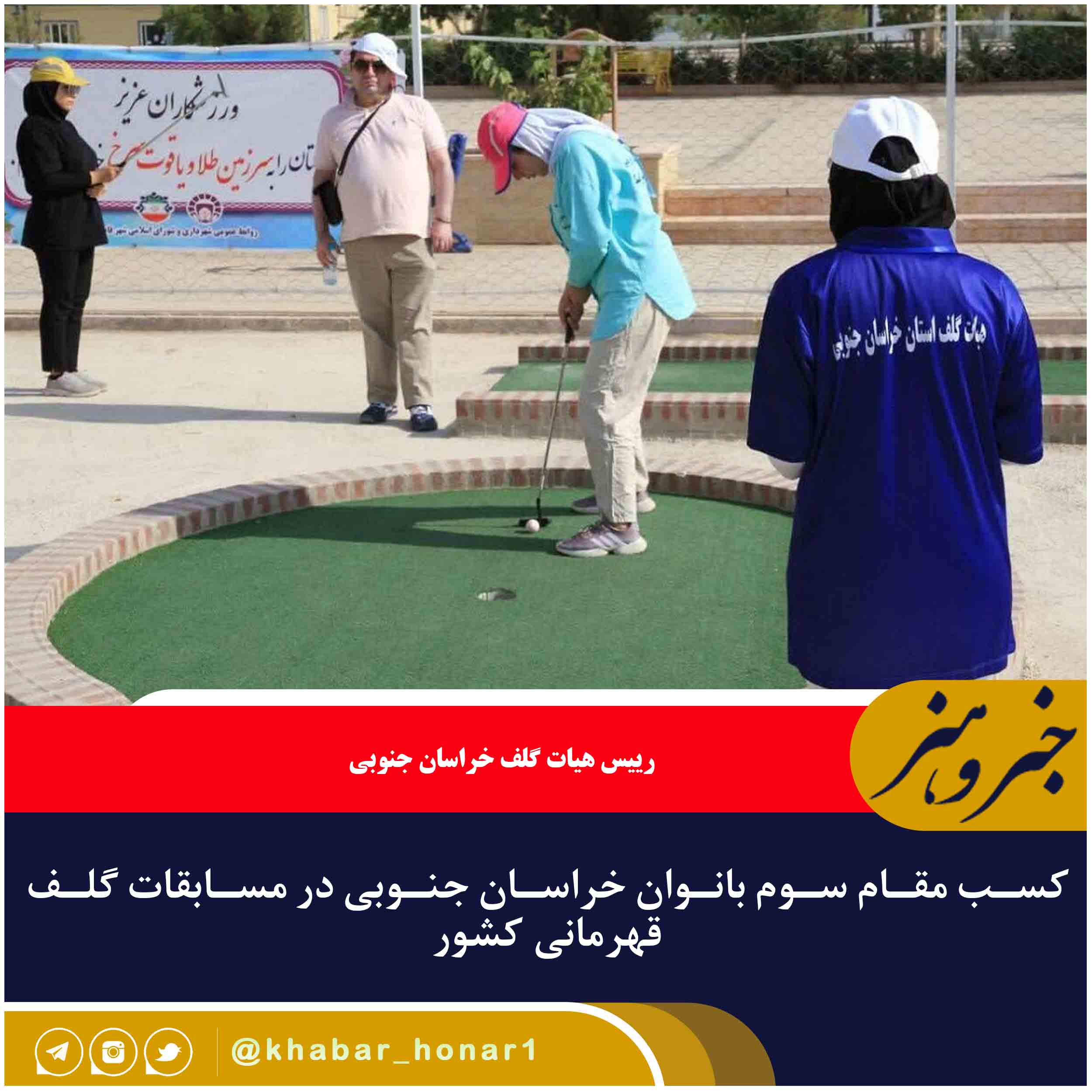 رییس هیات گلف خراسان جنوبی گفت: در بخش تیمی راند نهایی مسابقات آزاد کشوری مینی گلف انتخابی تیم ملی، تیم بانوان قم، اردبیل و خراسان جنوبی به ترتیب در جایگاههای اول تا سوم ایستادند.