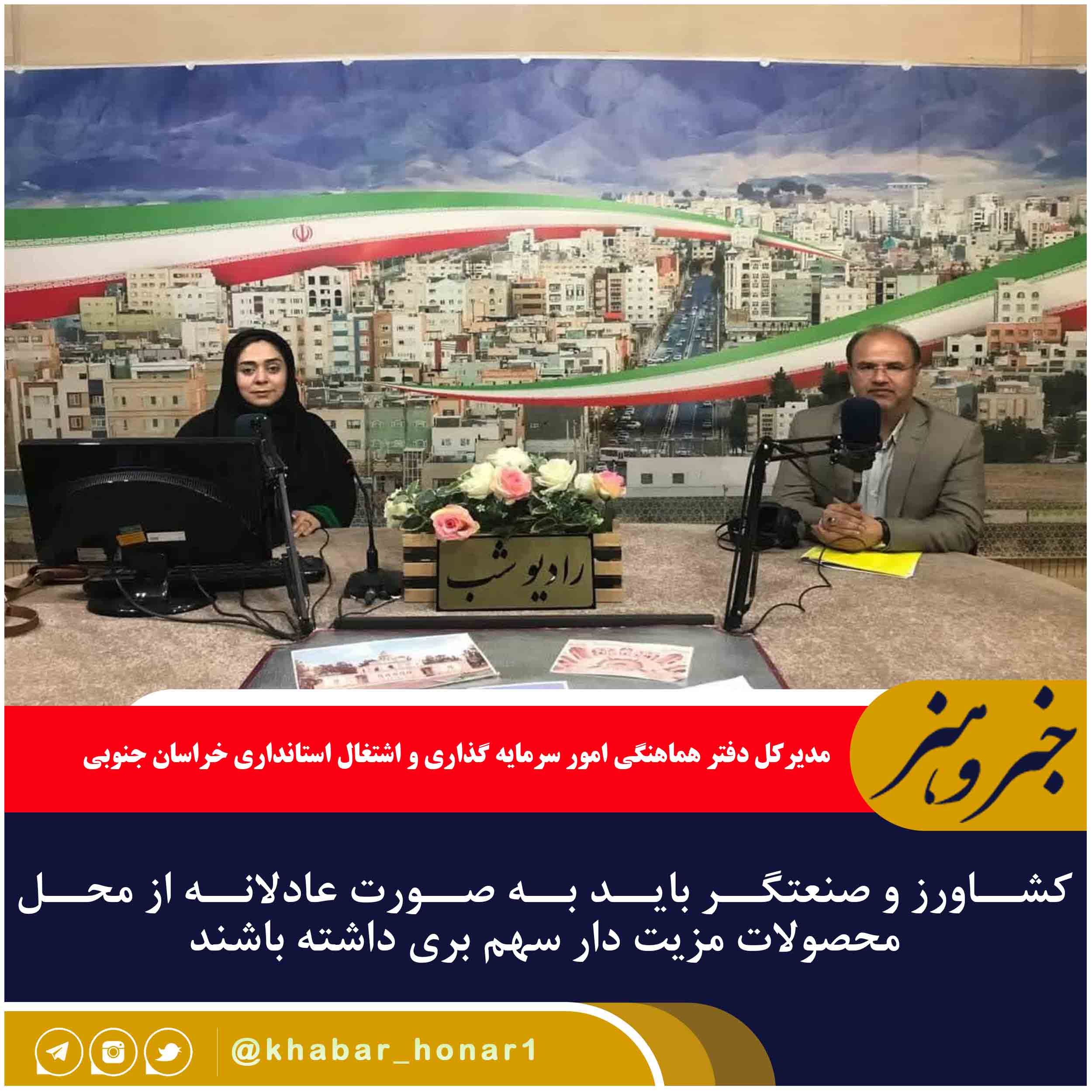 ?مدیرکل دفتر هماهنگی امور سرمایه گذاری و اشتغال استانداری خراسان جنوبی گفت: کشاورز و صنعتگر باید به صورت عادلانه از محل محصولات مزیت دار سهم بری داشته باشند