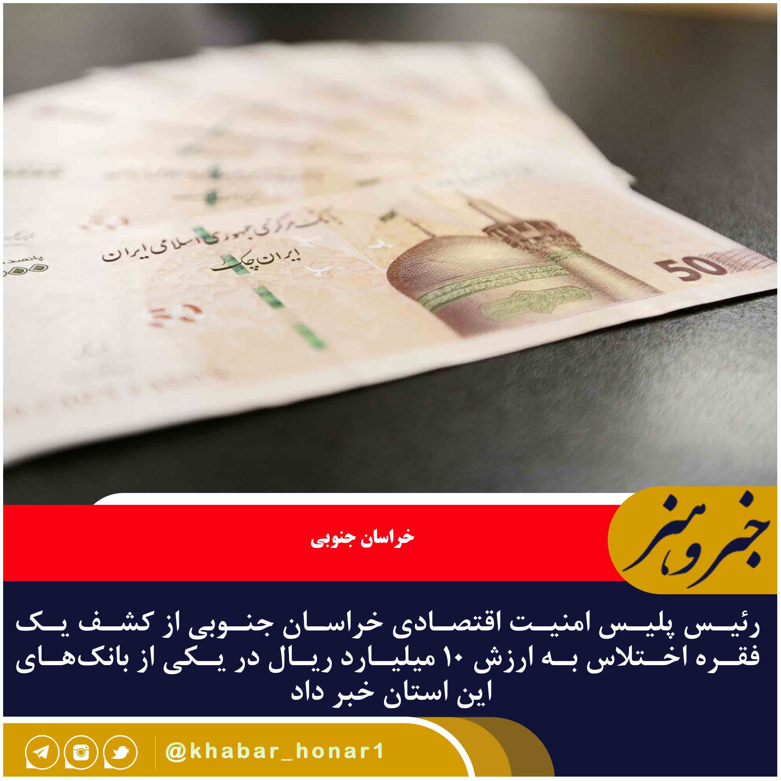 – رئیس پلیس امنیت اقتصادی خراسان جنوبی از کشف یک فقره اختلاس به ارزش ۱۰ میلیارد ریال در یکی از بانکهای این استان خبر داد.