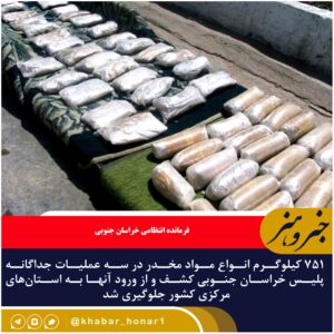 – ۷۵۱ کیلوگرم انواع مواد مخدر در سه عملیات جداگانه پلیس خراسان جنوبی کشف و از ورود آنها به استانهای مرکزی کشور جلوگیری شد.
