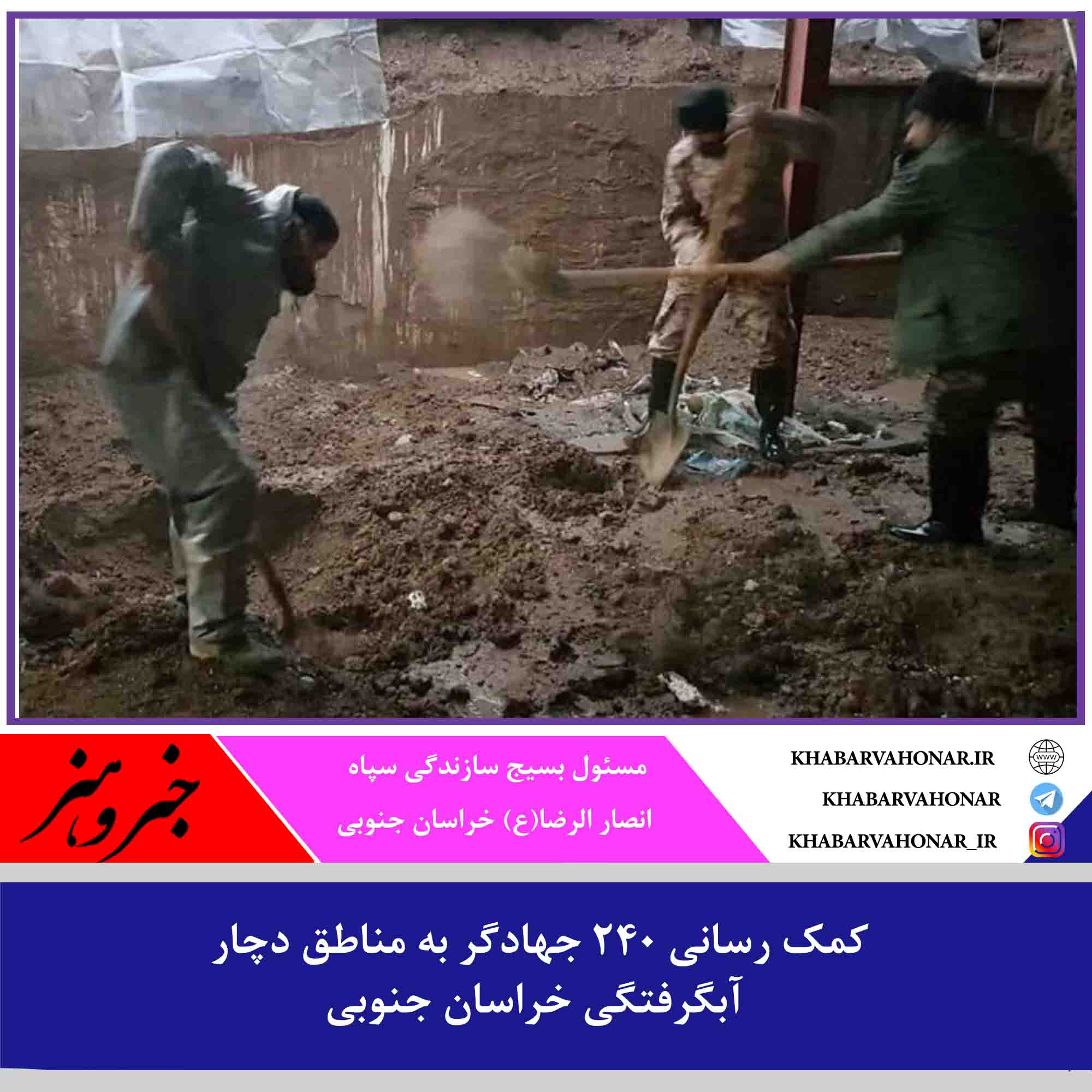 مسئول بسیج سازندگی سپاه انصار الرضا(ع) خراسان جنوبی از کمک رسانی بیش از ۲۴۰ جهادگر بسیجی در قالب ۲۵ گروه جهادی به مردم در روستاها و مناطق دچار آبگرفتگی استان خبر داد.