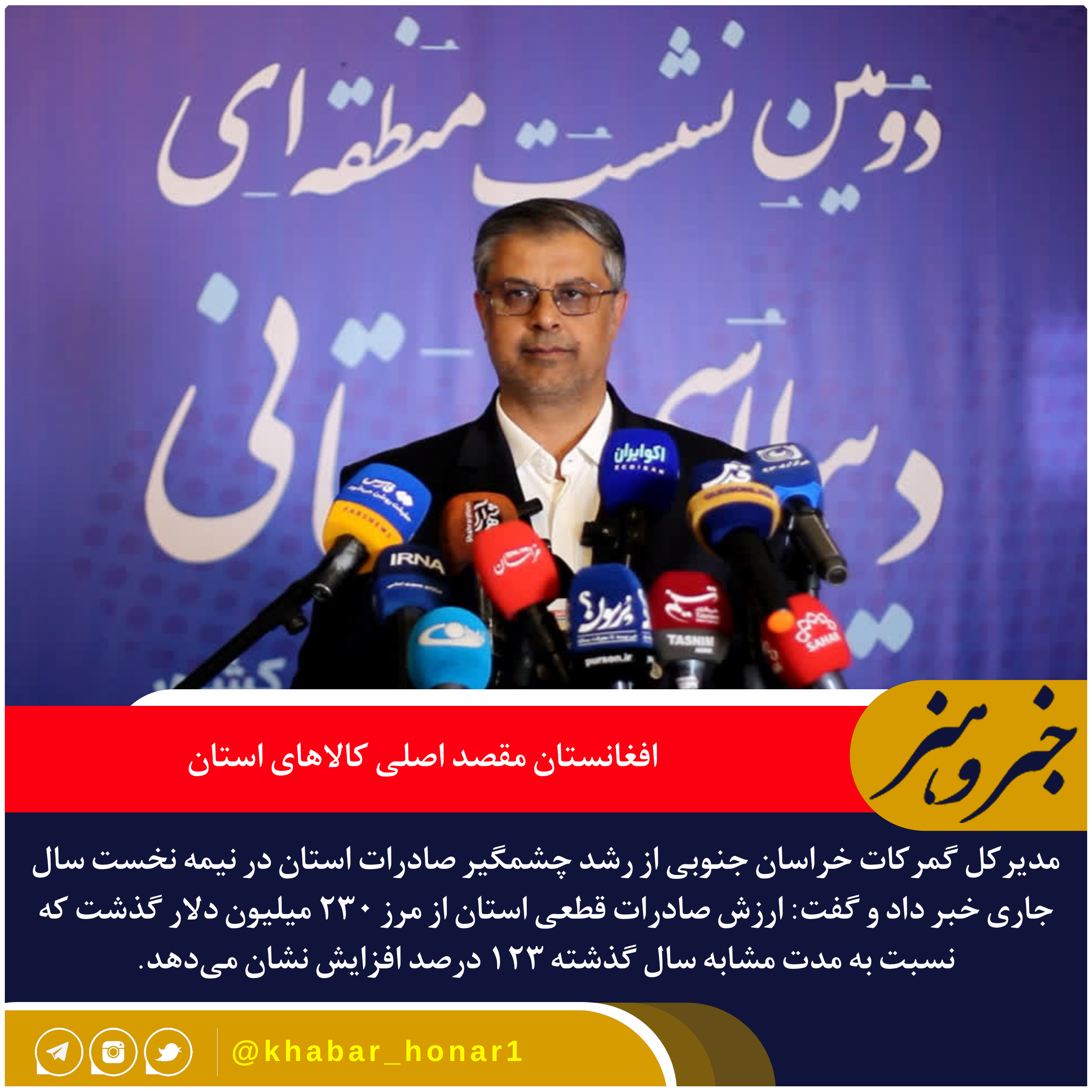 وی افزود: «عمده صادرات استان به کشور افغانستان انجام میشود، اما بخشی از کالاهای صادراتی نیز به کشورهای پاکستان، عراق و ترکیه ارسال میگردد.»