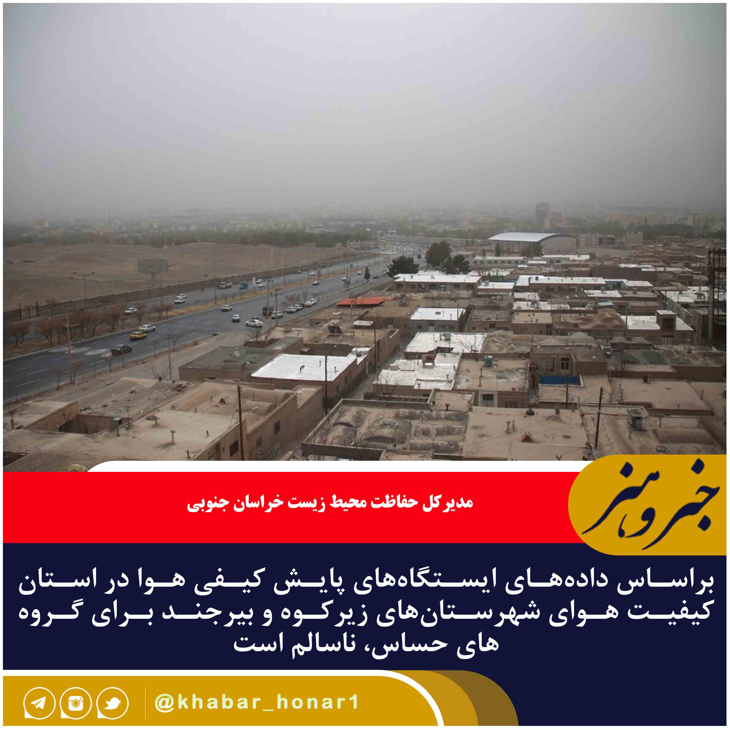 مدیرکل حفاظت محیط زیست خراسان جنوبی گفت: براساس دادههای ایستگاههای پایش کیفی هوا در استان کیفیت هوای شهرستانهای زیرکوه و بیرجند برای گروههای حساس، ناسالم است.