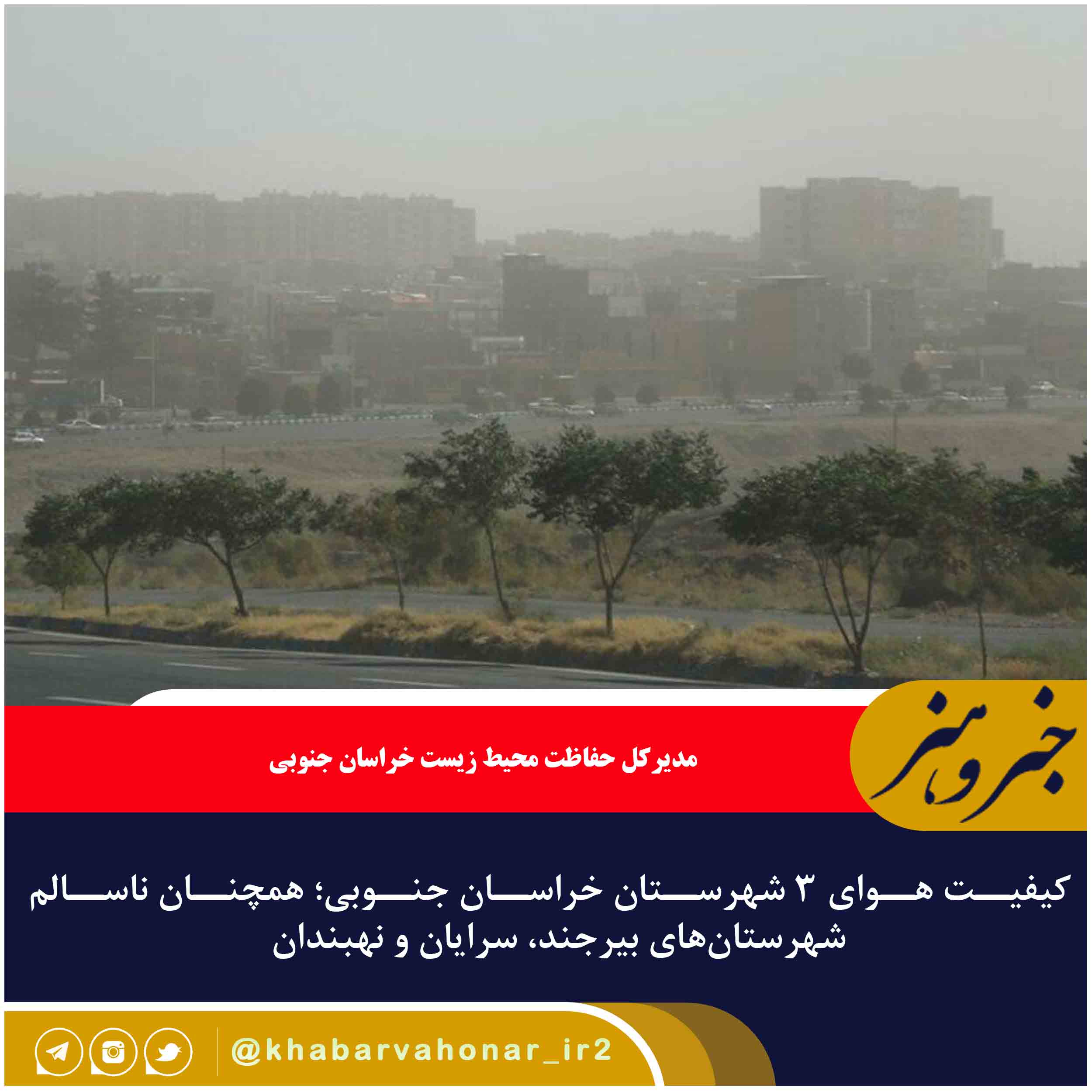 اسدالله حاتمی روز چهارشنبه ۵ مرداد به رسانهها اعلام کرد: براساس شاخص کیفیت هوا مختوم به ساعت هفت امروز کیفیت هوای شهرستان بیرجند با شاخص ۱۲۴، سرایان با شاخص ۱۵۲ و نهبندان با شاخص ۱۵۹ در وضعیت ناسالم برای گروههای حساس قرار گرفت.