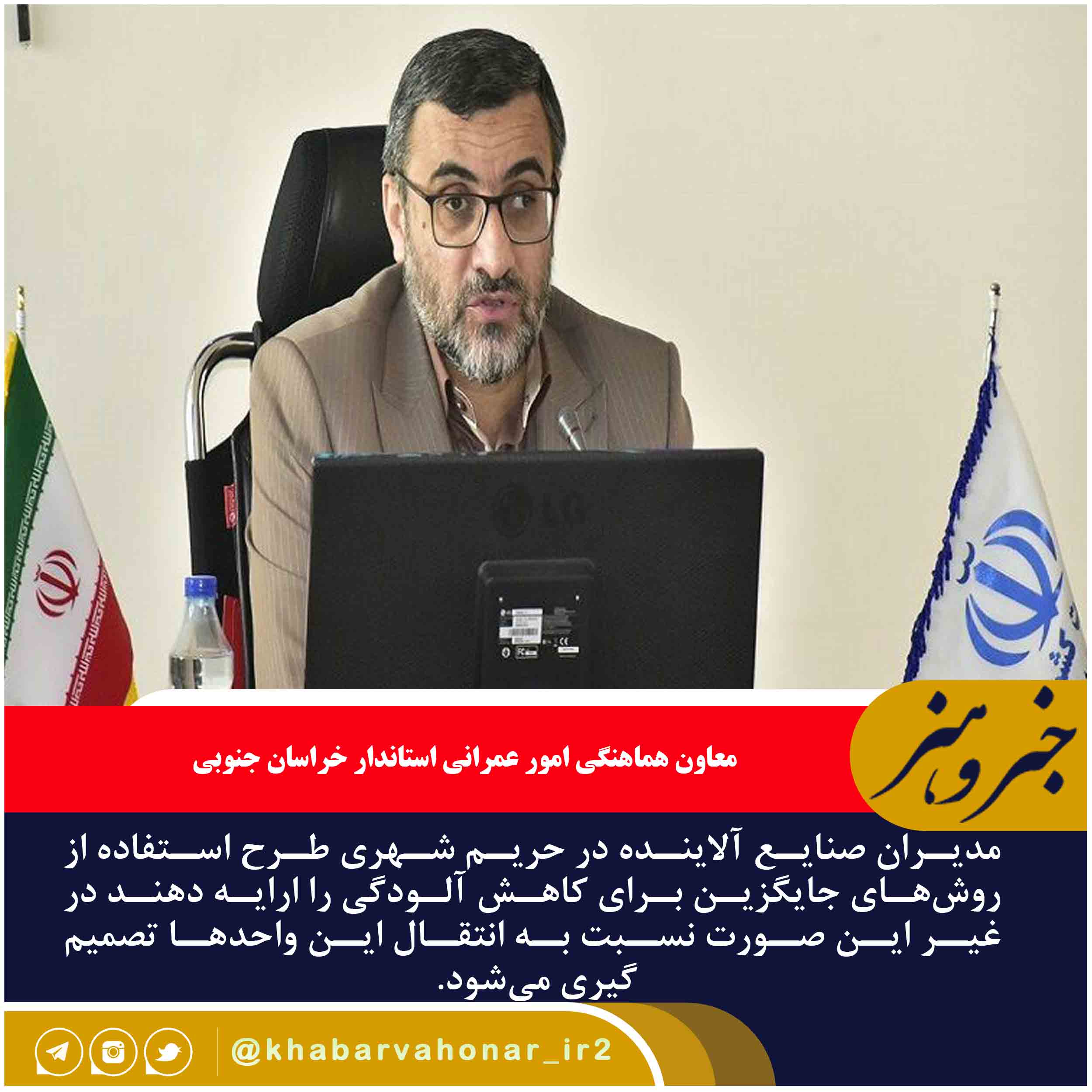 معاون هماهنگی امور عمرانی استاندار خراسان جنوبی گفت: مدیران صنایع آلاینده در حریم شهری طرح استفاده از روشهای جایگزین برای کاهش آلودگی را ارایه دهند در غیر این صورت نسبت به انتقال این واحدها تصمیمگیری میشود.