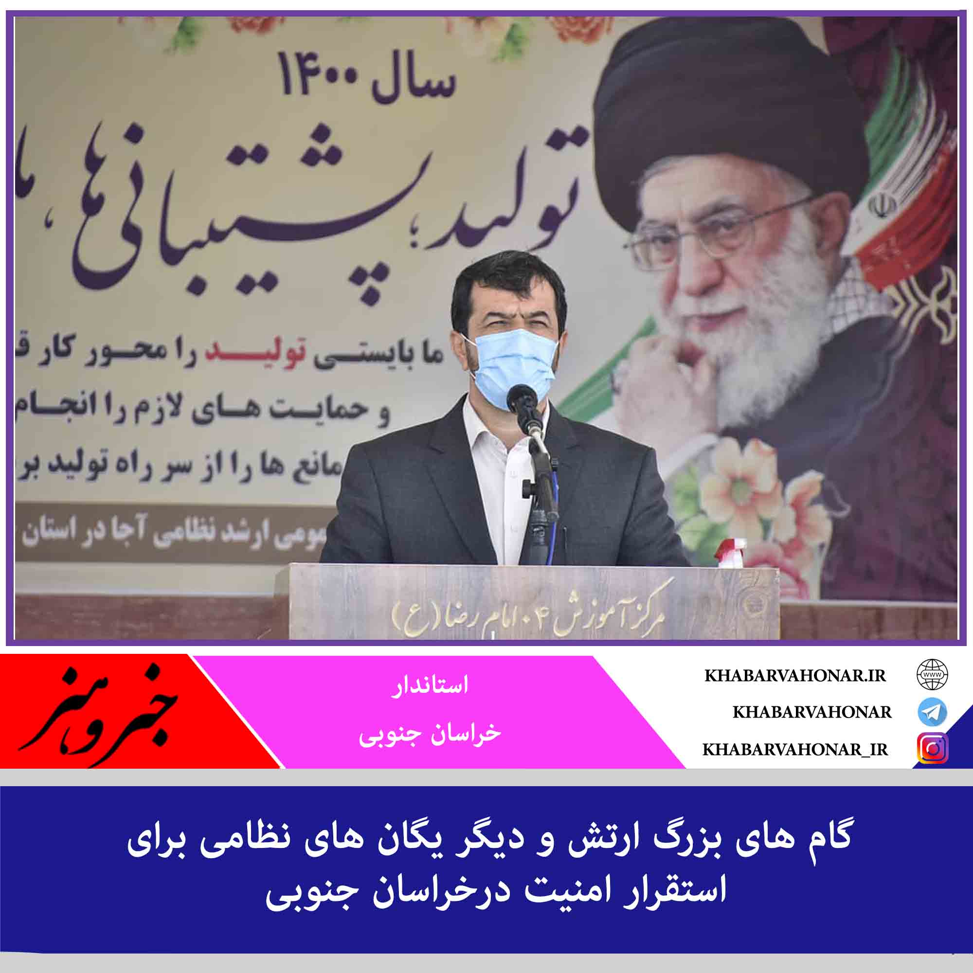 وی ادامه داد: استان خراسان جنوبی هم از این نعمت بزرگ به معنای واقعی بهرهمند است خراسان جنوبی یکی از استانهای مرزی و از مرزهای بزرگ کشور با افغانستان است و برای حفظ امنیت کشور و اقتدار نیاز به این حضور دارد و این حضور نه تنها در مرز که در گوشه گوشه استان است.