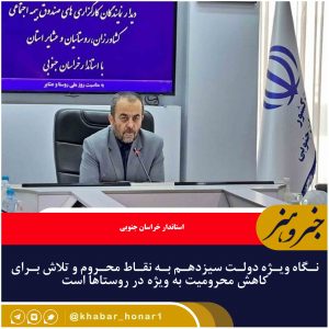 استاندار خراسان جنوبی با اشاره به اینکه استقلال اقتصادی در پرتو توانمندسازی روستا محقق می شود، گفت: نگاه ویژه دولت توجه به مناطق محروم، گسترش عدالت و توزیع عادلانه ثروت است.