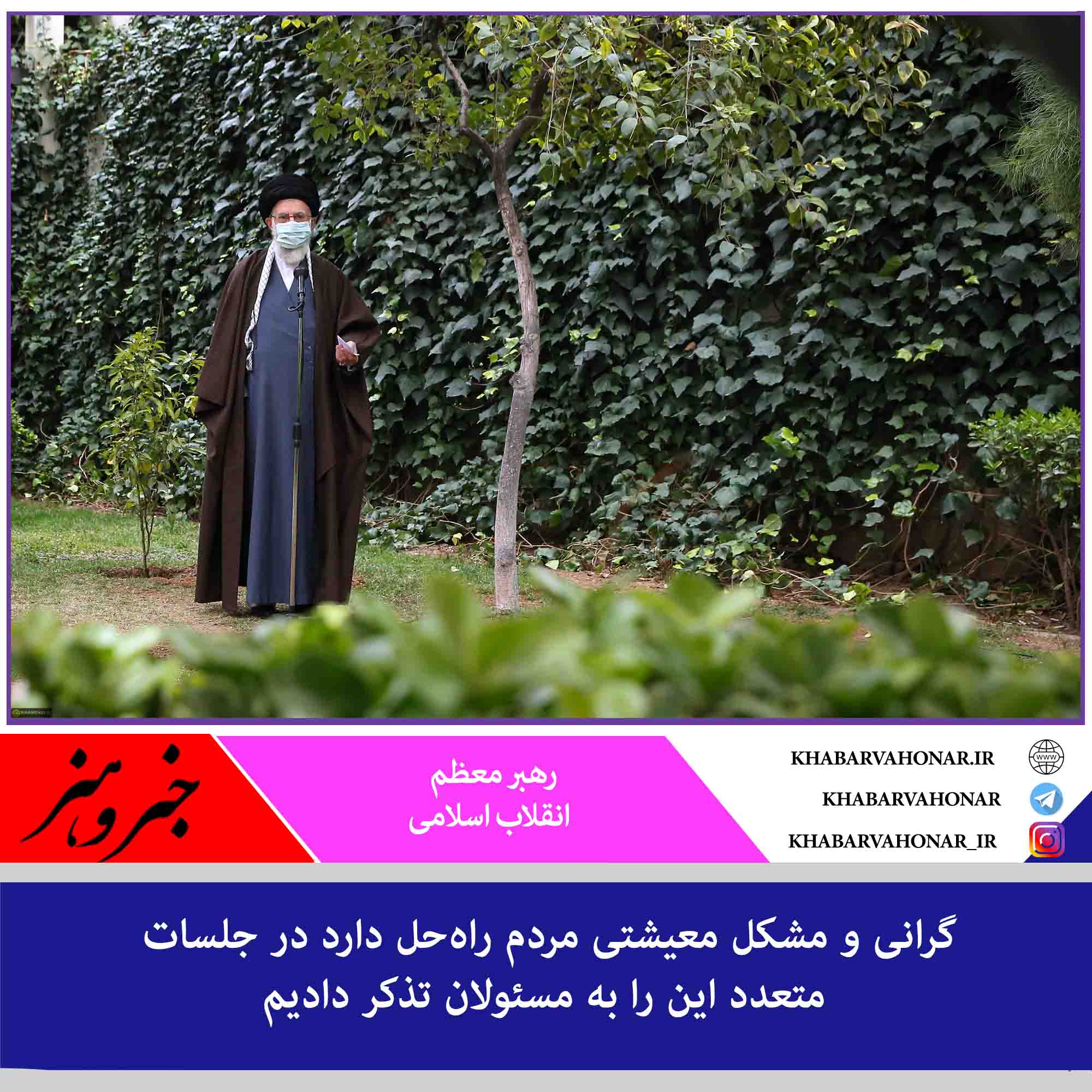 رهبر انقلاب اسلامی با ابراز ناخرسندی از گرانی‌ها و مشکلات معیشتی، افزودند: این وضع در آستانه عید غصه بزرگی ایجاد کرده است. البته اجناس مانند میوه‌ها فراوان است اما قیمت‌ها بسیار بالا است که سود این قیمت بالا هم به جیب باغداران زحمتکش نمی‌رود بلکه نصیب دلالها و واسطه‌های سودجو می‌شود و ضرر آن به مردم می‎رسد.