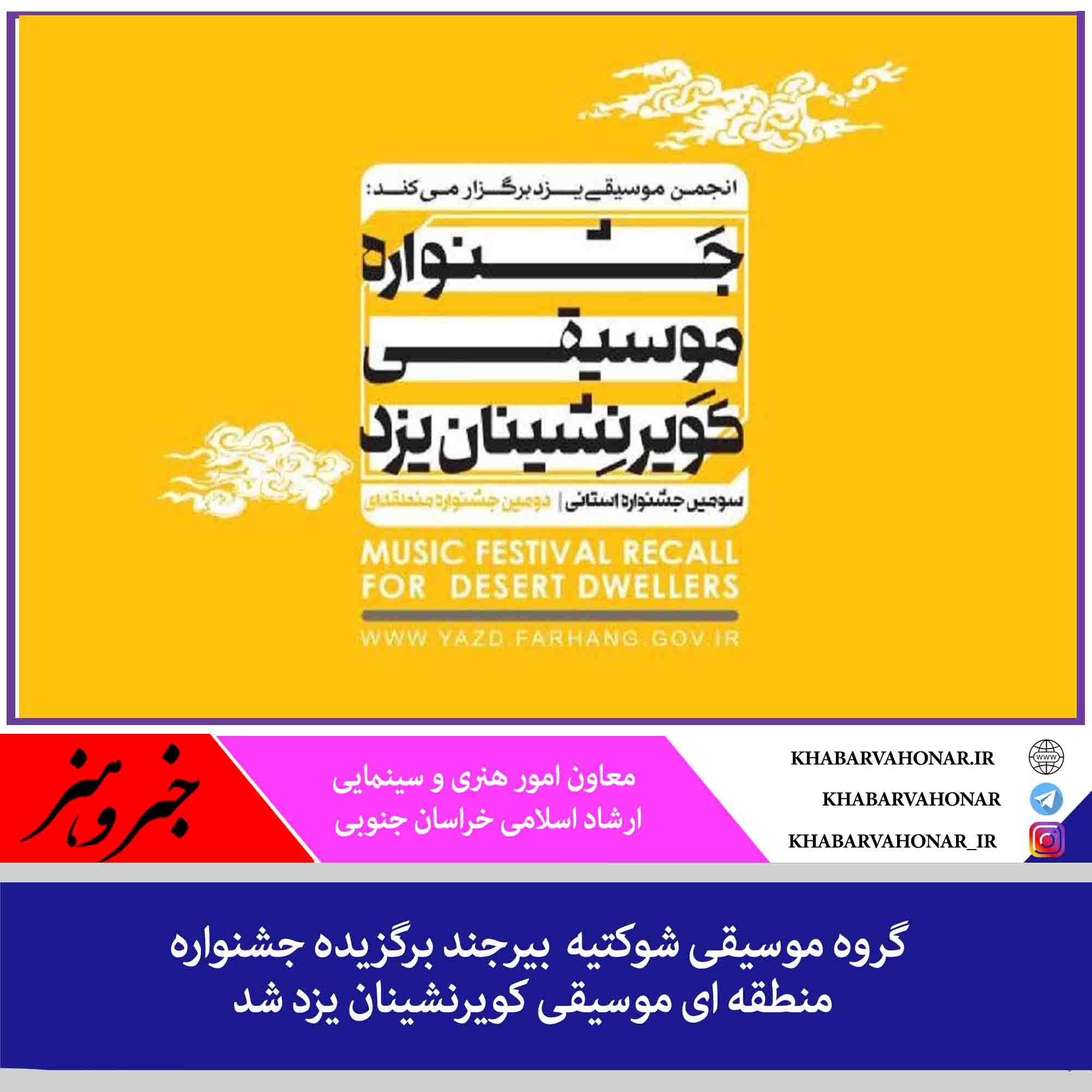 معاون امور هنری و سینمایی اداره کل فرهنگ و ارشاد اسلامی خراسان جنوبی گفت: با اعلام نتایج سومین جشنواره منطقه ای موسیقی کویرنشینان یزد ، گروه شوکتیه از استان برگزیده شد.، سید علی زمزم با بیان این که این جشنواره با حضور استانهای یزد، اصفهان، کرمان، کرمان جنوب، خراسان جنوبی و سیستان و بلوچستان برگزار شد، ادامه داد: در بخش منطقه ای گروه شوکتیه از استان خراسان جنوبی توانست رتبه اول را به خود اختصاص دهد .