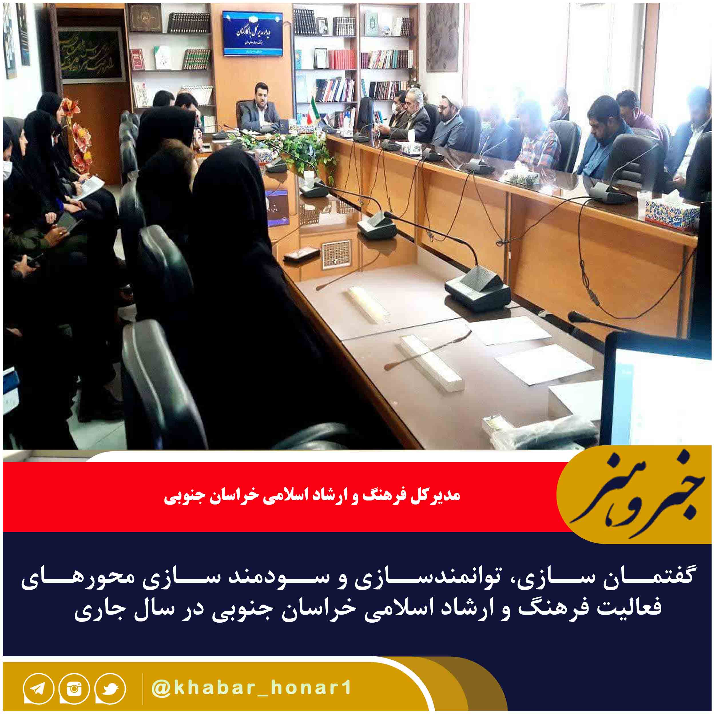 مدیرکل فرهنگ و ارشاد اسلامی خراسان جنوبی در اولین دیدار با کارکنان این اداره در سال جاری اظهار کرد: بر مبنای سند تحول شیوه عملکرد این اداره بر سه ضلع گفتمان سازی، توانمندسازی و سودمندسازی استوار خواهد بود. علی فرخنده در این نشست گفت: این ظرفیت در اداره کل فرهنگ و ارشاد اسلامی وجود دارد که در تمامی برنامه های فرهنگی، هنری، رسانهای و قرآنی برای سایر نهادها در این زمینه وجود دارد و نقش نظارتی خود را در چارچوب قانون، اجرایی نماید.