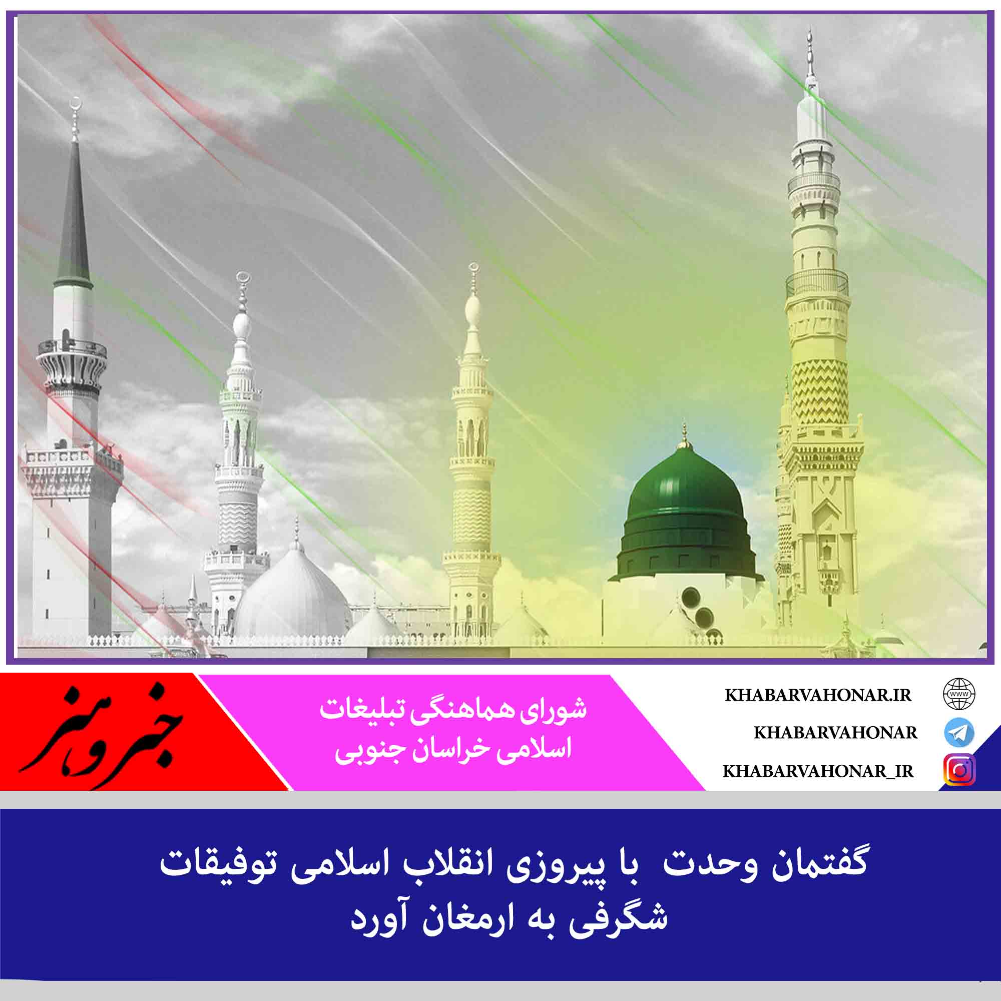 شورای هماهنگی تبلیغات اسلامی خراسان جنوبی در بیانیه ای به منـاسـبت هفتـه وحدت اعلام کرد: گفتمان وحدت با پیروزی انقلاب اسلامی و بازخوانی ضرورتهای اسلام توسط احیاگر اسلام ناب محمدی(ص) حضرت امام خمینی(ره) و پیگیری جانشین شایسته ایشان رهبر معظم انقلاب توفیقات شگرفی را در جهان اسلام برای مسلمین به ارمغان آورد.