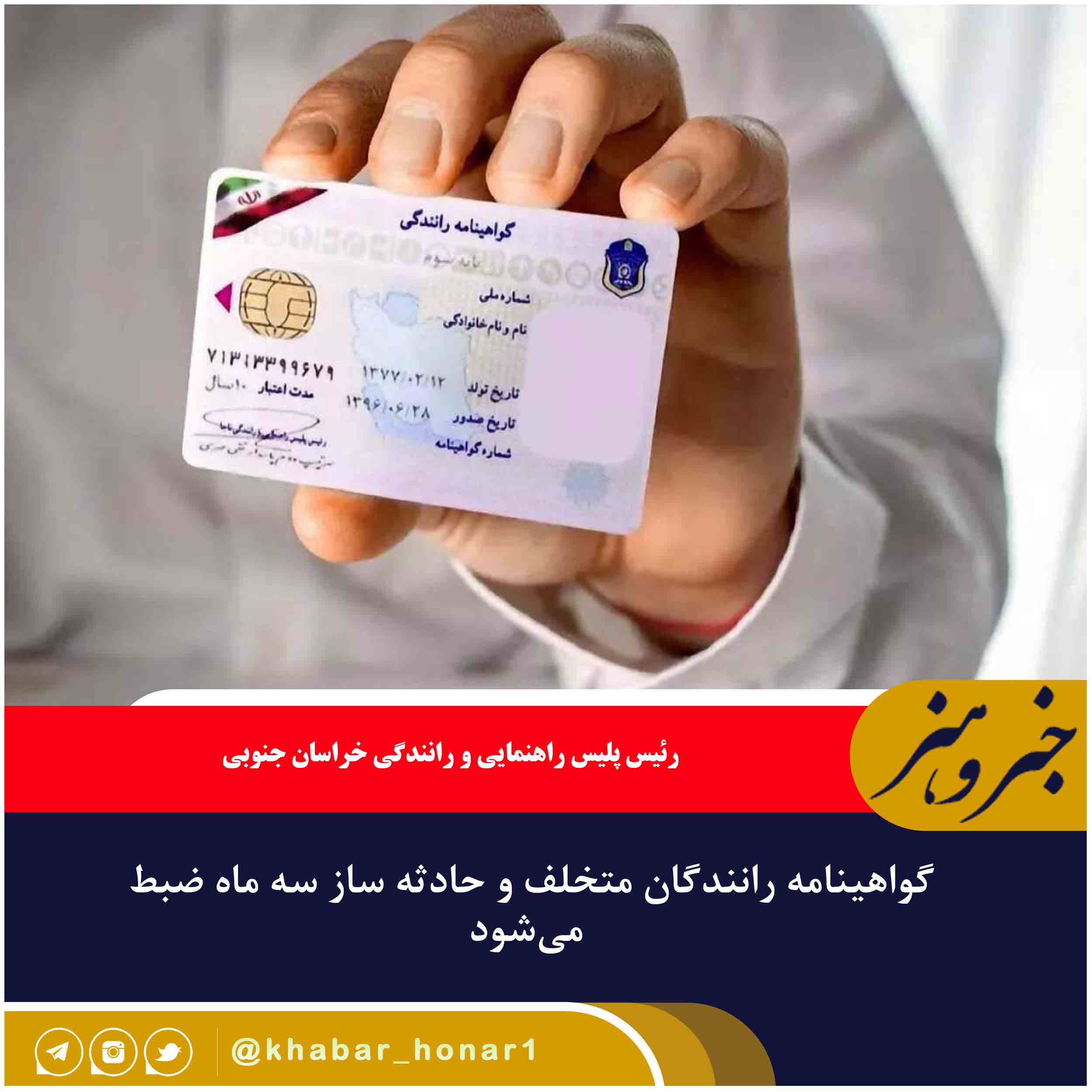 رئیس پلیس راهنمایی و رانندگی خراسان جنوبی گفت: از ۱۳ فروردین تا ۱۶ ماه جاری گواهینامه رانندگانی که یک تخلف حادثه ساز داشته باشند به مدت سه ماه ضبط میشود.