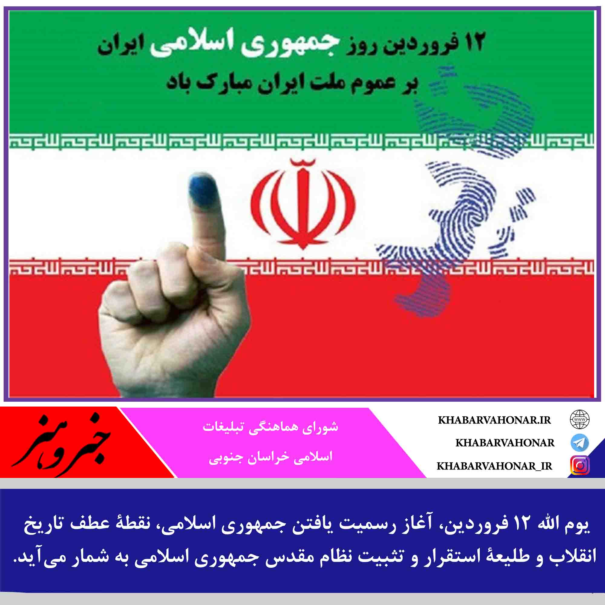 یوم الله ۱۲ فروردین، تجلی و تحقق ارادۀ ملی در استقرار نظام مقدس جمهوری اسلامی و تکمیل و تثبیت پیروزی غرورآفرین انقلاب شکوهمند اسلامی ایران در بهمن ۱۳۵۷ و اقتدار و عزت برای ایران و اسلام در پرتو شعار همیشه جاوید «استقلال، آزادی و جمهوری اسلامی» است.