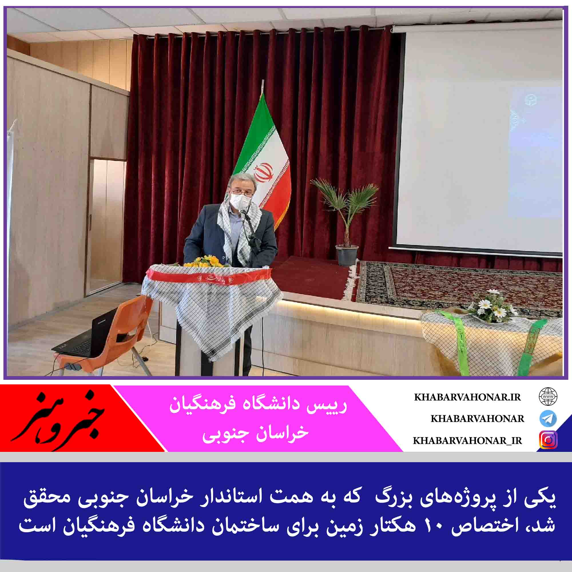 رییس دانشگاه فرهنگیان خراسان جنوبی گفت: یکی از پروژه‌های بزرگ ما که به همت استاندار خراسان جنوبی محقق شد، اختصاص ۱۰ هکتار زمین برای ساختمان دانشگاه فرهنگیان است و با همکاری اداره کل نوسازی، توسعه و تجهیز مدارس استان انجام می‌شود.