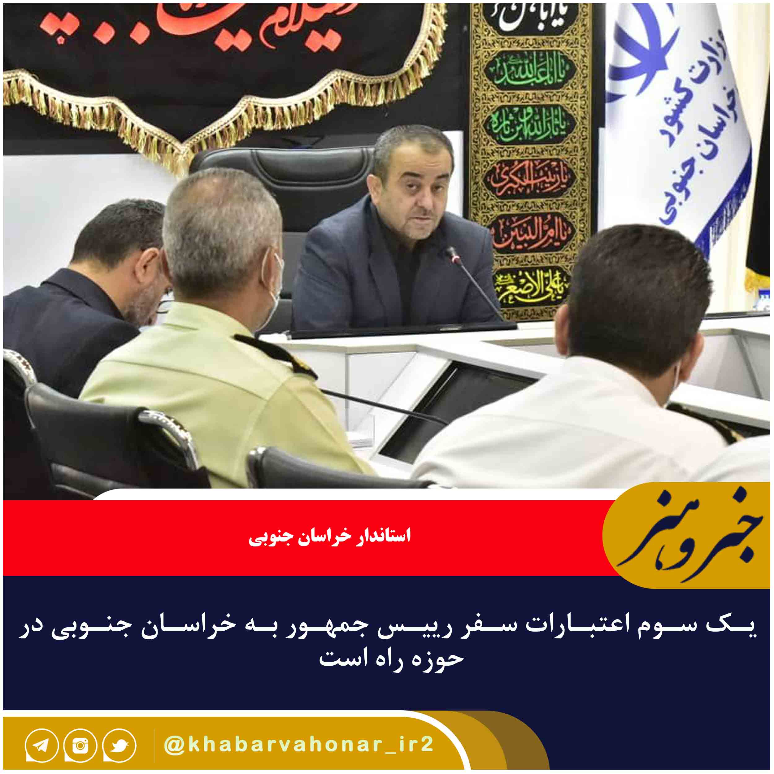 استاندار خراسان جنوبی گفت: با توجه به اهمیت تامین زیرساخت‌های مربوط به جاده‌های استان یک سوم اعتبارات سفر رییس جمهور مربوط به حوزه راه است که نشان از عزم جدی دولت سیزدهم به این حوزه است.