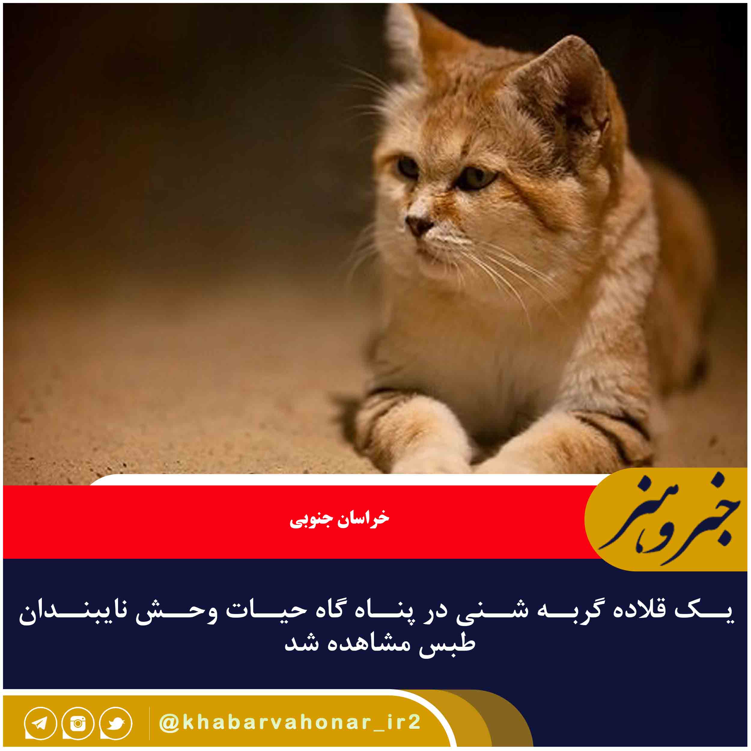 مرتضی تقی زاده، به رسانههای گروهی گفت: محمدرضا آزاد همیار افتخاری محیط زیست یک قلاده گربه شنی را به طور مستقیم در پناه گاه حیات و حش نایبندان طبس مشاهده و از آن عکسبرداری کرد.