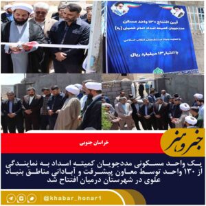 در سفر معاون آبادانی و پیشرفت بنیاد علوی کشور به شهرستان درمیان و با حضور معاون سیاسی استانداری خراسان جنوبی یک واحد مسکونی مددجویان کمیته امداد به نمایندگی از ۱۳۰ واحد که با حمایت ۱۳ میلیارد ریالی بنیاد مستضعفان تکمیل شده است افتتاح شد