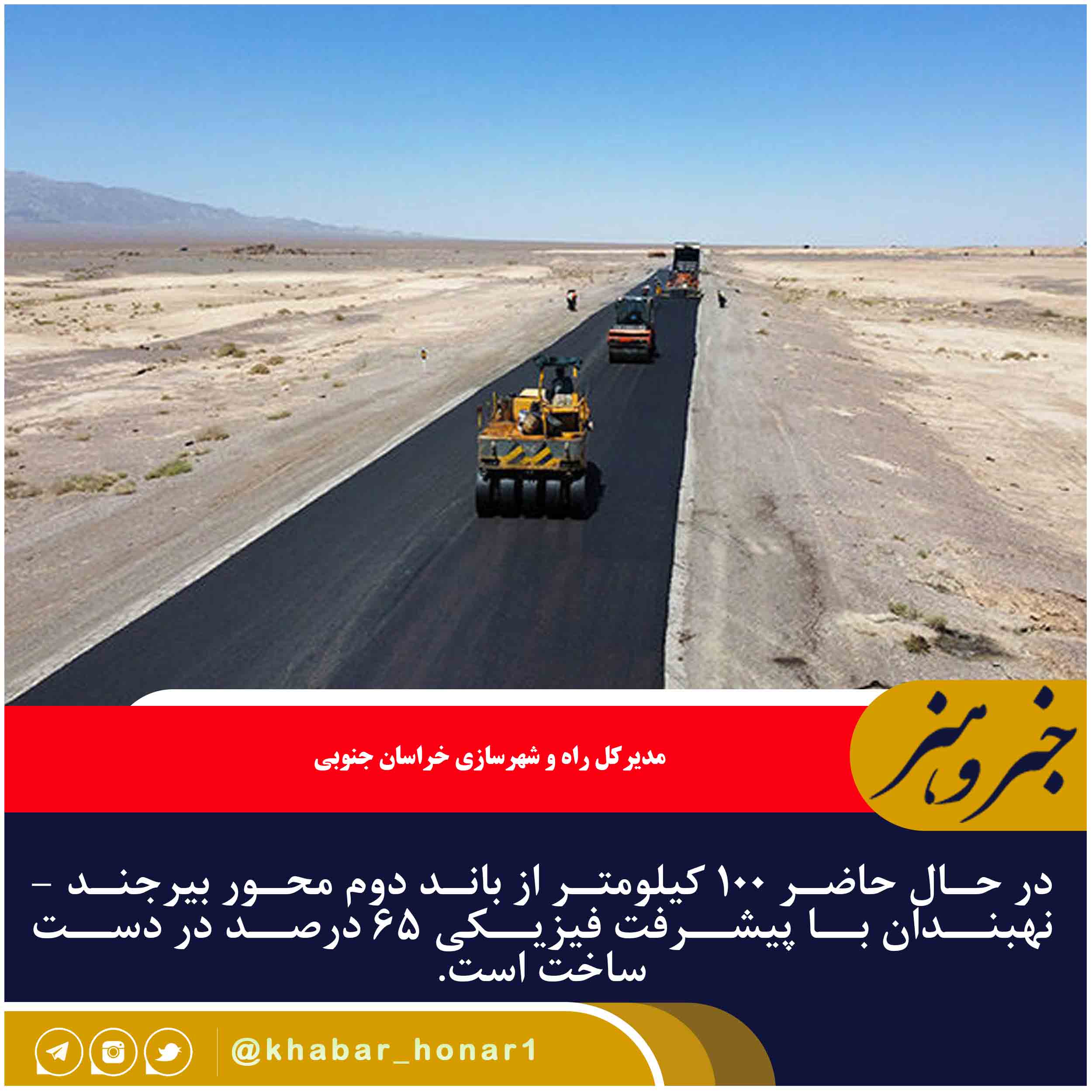 مدیرکل راه و شهرسازی خراسان جنوبی گفت: در حال حاضر ۱۰۰ کیلومتر از باند دوم محور بیرجند – نهبندان با پیشرفت فیزیکی ۶۵ درصد در دست ساخت است.
