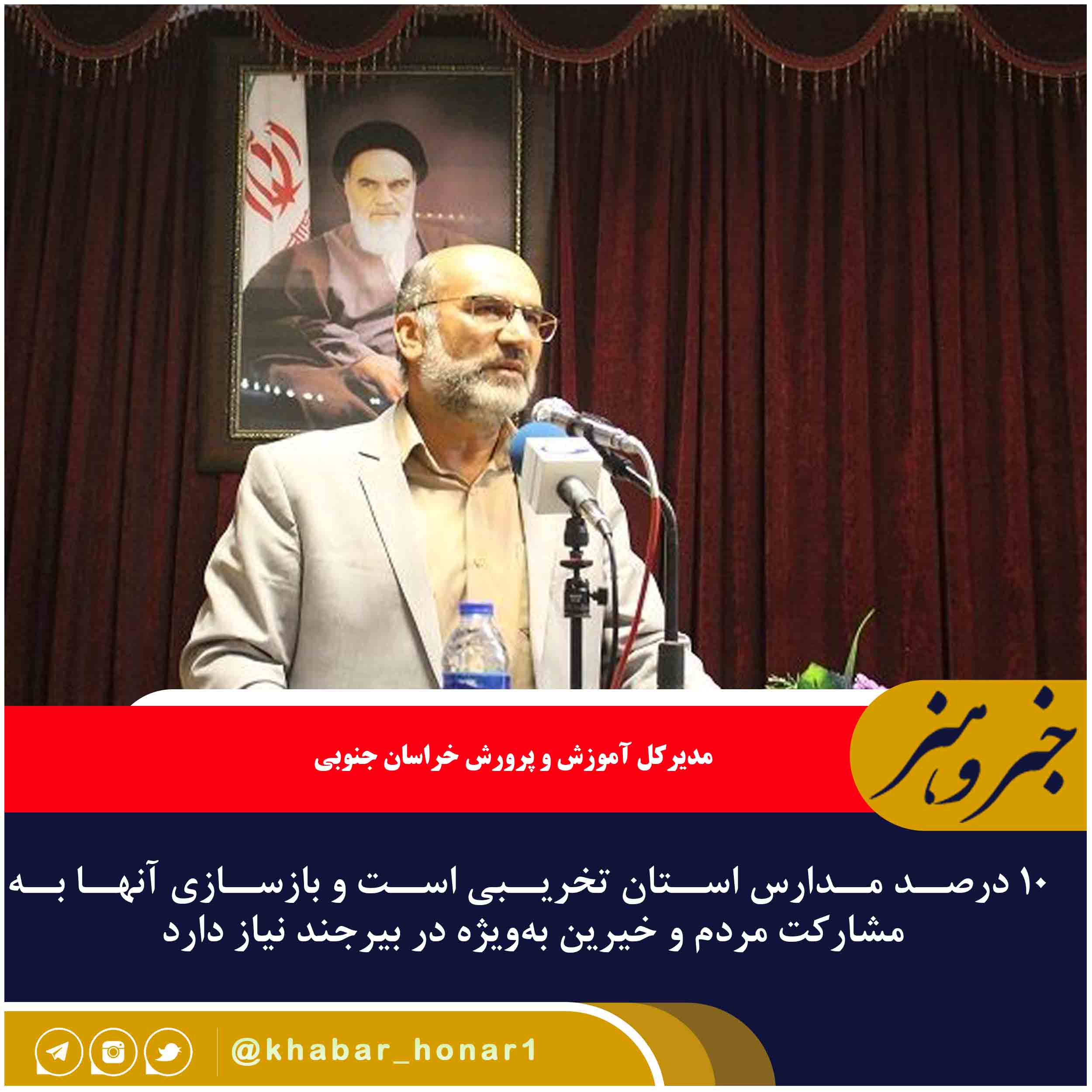 مدیرکل آموزش و پرورش خراسان جنوبی گفت: ۱۰ درصد مدارس این استان تخریبی است و بازسازی آنها به مشارکت مردم و خیرین بهویژه در بیرجند نیاز دارد.