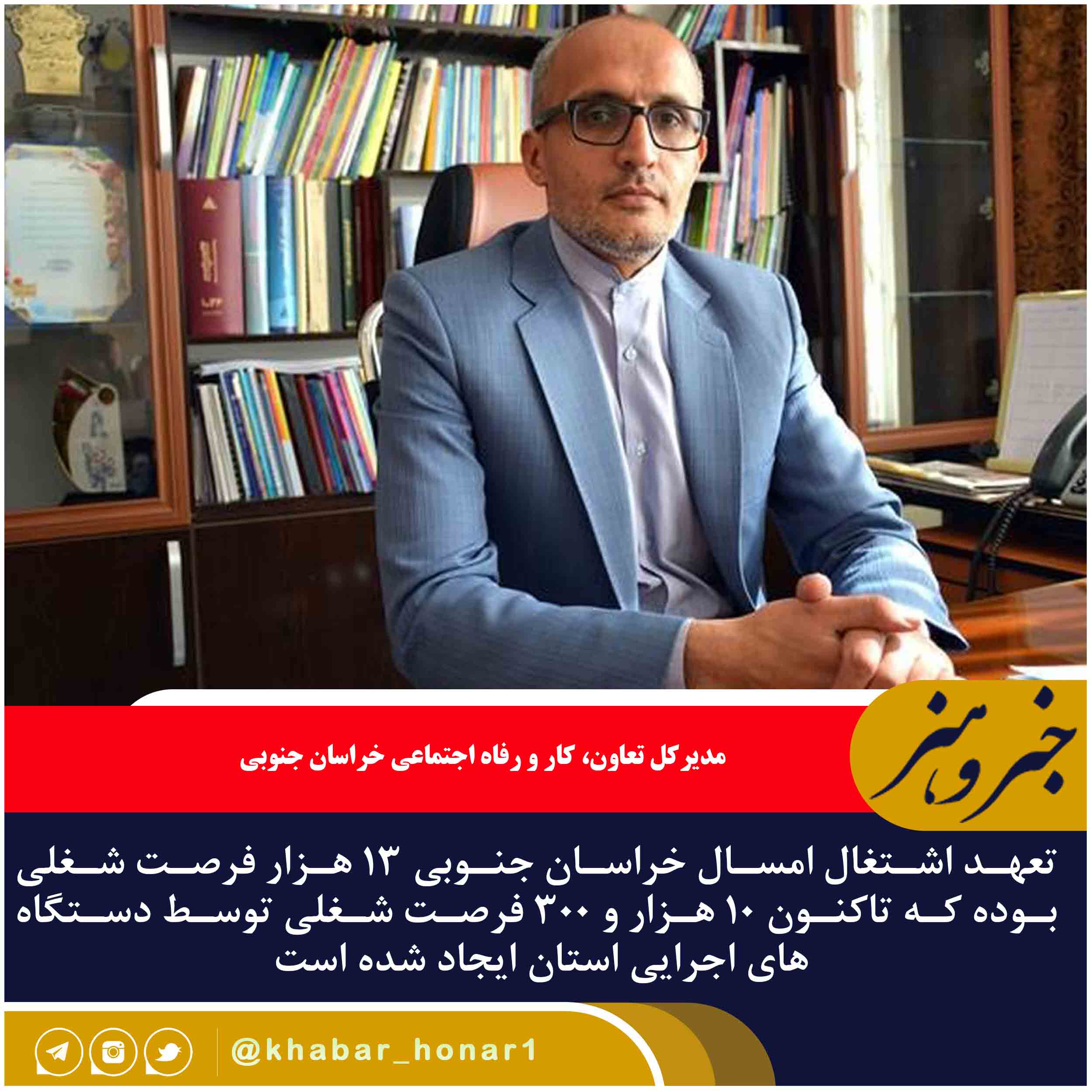 مدیرکل تعاون، کار و رفاه اجتماعی خراسان جنوبی اعلام کرد: تعهد اشتغال امسال خراسان جنوبی ۱۳ هزار فرصت شغلی بوده که تاکنون ۱۰ هزار و ۳۰۰ فرصت شغلی توسط دستگاههای اجرایی استان ایجاد شده است.