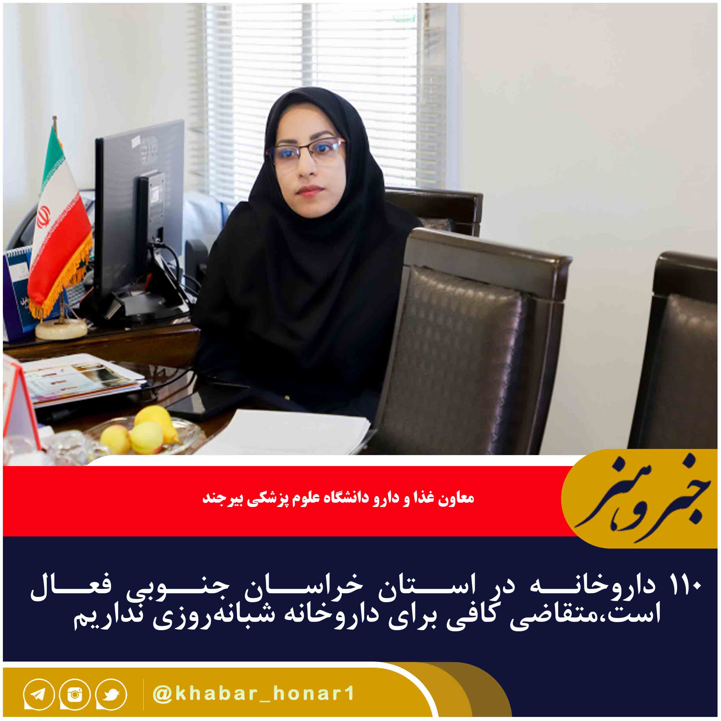 معاون غذا و دارو دانشگاه علوم پزشکی بیرجند گفت: ۱۱۰ داروخانه در استان خراسان جنوبی فعال است که نسبت به گذشته افزایش داشته و رضایتمندی مردم را شاهد هستیم.