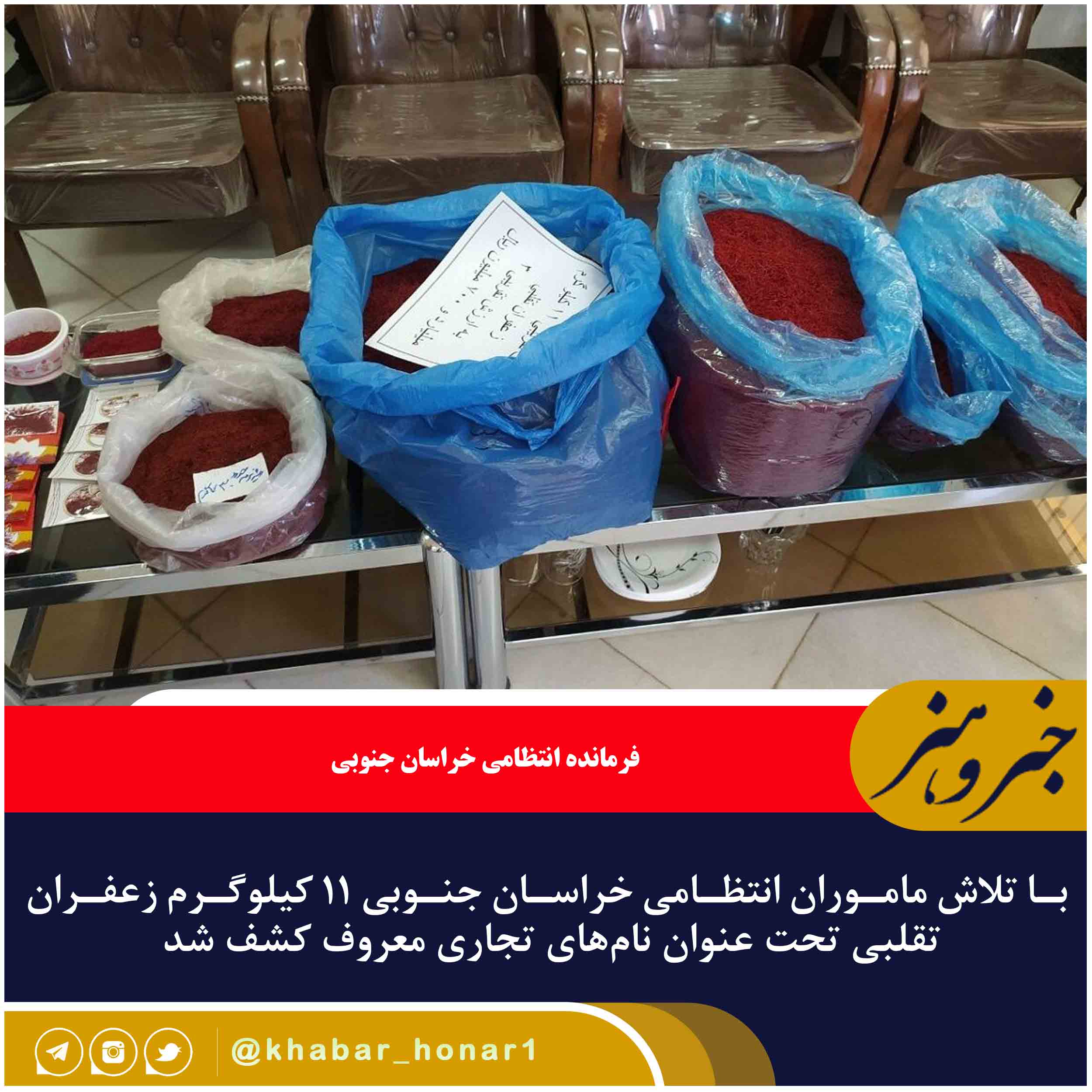 فرمانده انتظامی خراسان جنوبی گفت: با تلاش ماموران انتظامی خراسان جنوبی ۱۱ کیلوگرم زعفران تقلبی تحت عنوان نامهای تجاری معروف کشف شد.