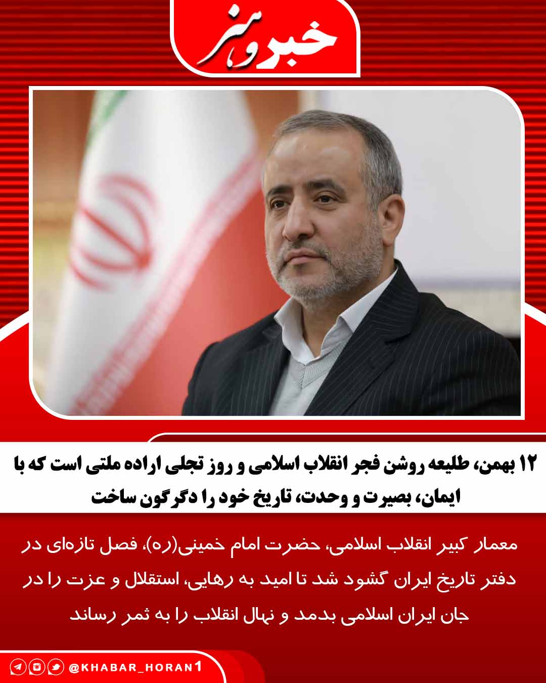 🔹ایام الله دهه فجر، فرصتی مغتنم برای بازخوانی آرمانهای بلند انقلاب اسلامی و تجدید میثاق با ارزشهایی است که با خون شهیدان و ایستادگی ملت بزرگ ایران تثبیت شد، و اینک با گذشت ۴۷ سال از آن اتفاق میمون و در امتداد آن راه نورانی، آنچه میتواند به پاسداشت آرمانهای انقلاب و تقویت اعتماد عمومی بینجامد، خدمت صادقانه، مسئولیتپذیری، عدالت محوری و تلاش بیوقفه برای رفع دغدغههای مردم است، مردم ولایتمداری که در همه این سالها و در گذر از همه فراز و فرودهای متأثر از کینه بدخواهان، همواره مدافع کیان میهن بوده و در این مسیر، جانها هدیه کردهاند.