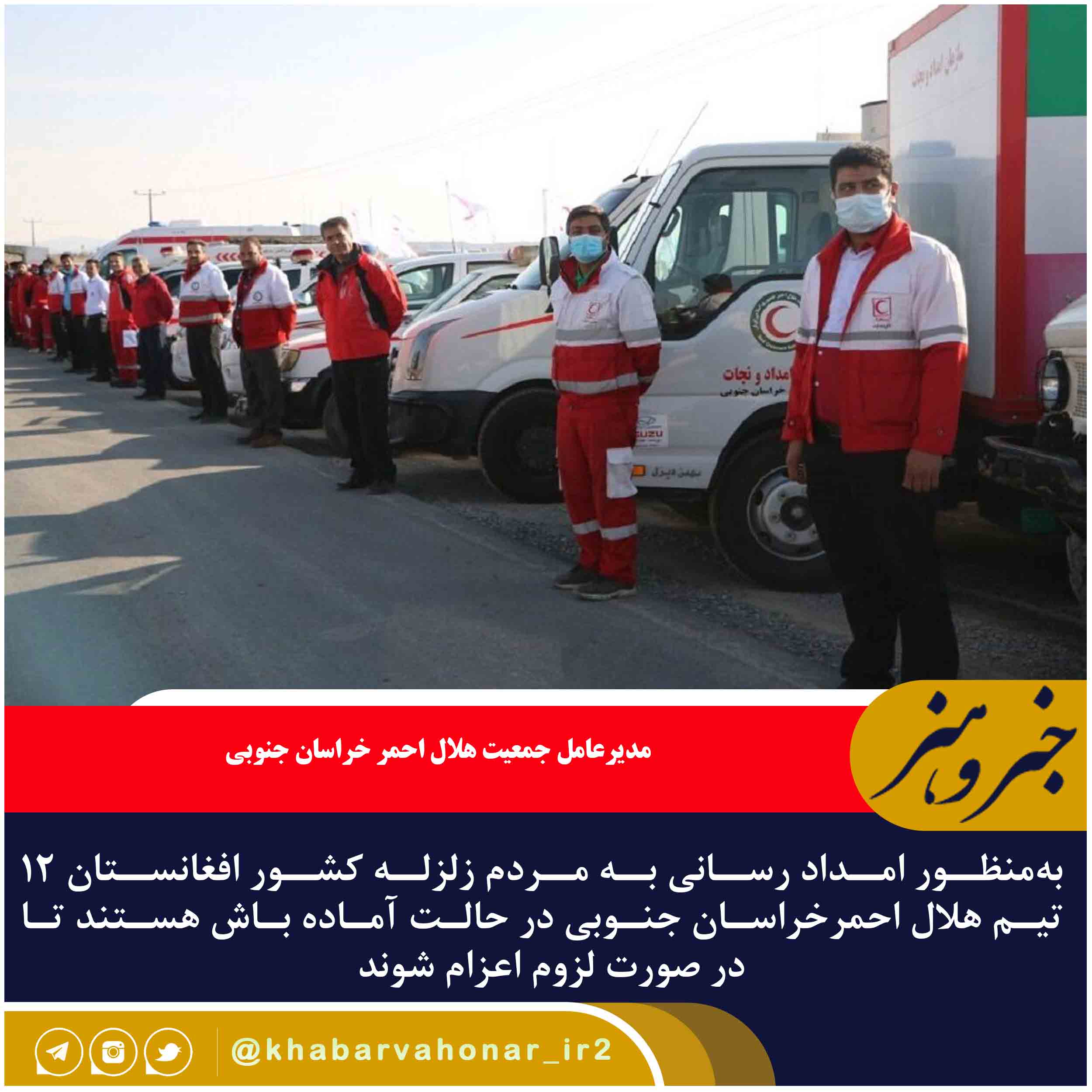 مدیرعامل جمعیت هلال احمر خراسان جنوبی گفت: بهمنظور امداد رسانی به مردم زلزله کشور افغانستان ۱۲ تیم هلال احمر استان در حالت آماده باش هستند تا در صورت لزوم اعزام شوند.