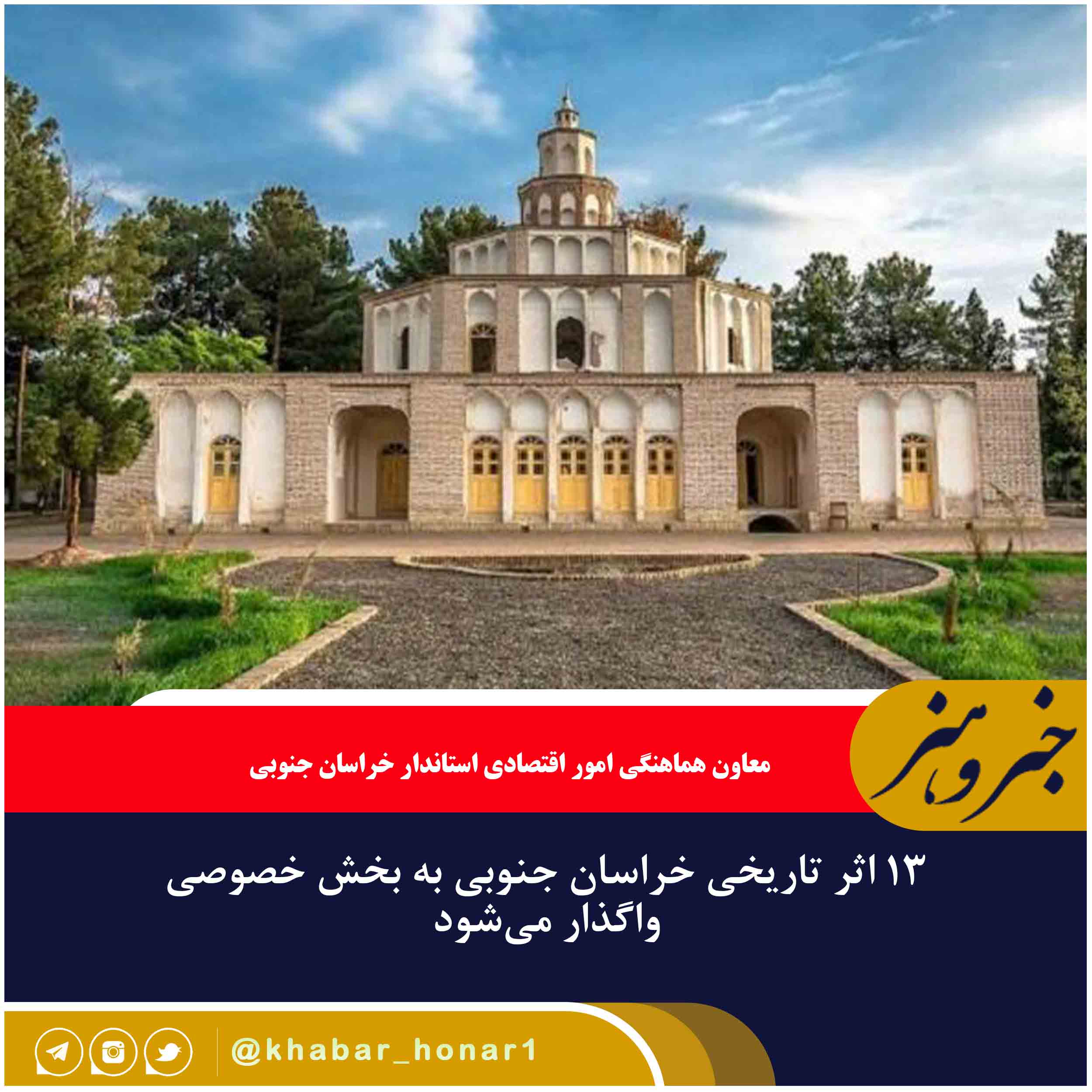 معاون هماهنگی امور اقتصادی استاندار خراسان جنوبی گفت: ۱۳ اثر تاریخی استان با هدف رشد و توسعه گردشگری و حمایت صندوق احیا و بهرهبرداری از اماکن تاریخی و فرهنگی کشور به بخش خصوصی واگذار میشود.
