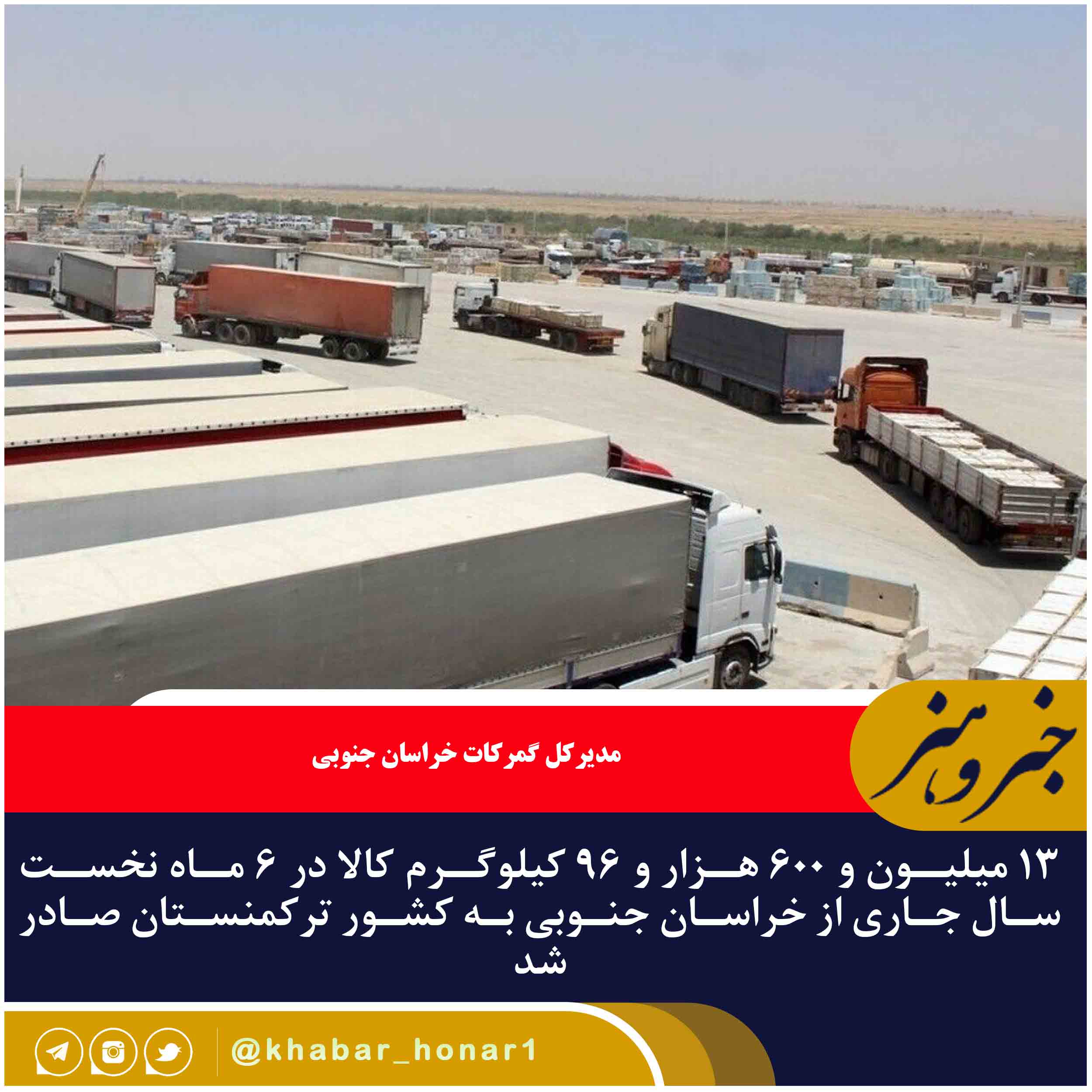 مدیرکل گمرکات خراسان جنوبی گفت: ۱۳ میلیون و ۶۰۰ هزار و ۹۶ کیلوگرم کالا در ۶ ماه نخست سال جاری از خراسان جنوبی به کشور ترکمنستان صادر شده که نسبت به مدت مشابه سال قبل از نظر ارزش ۵۲ درصد رشد داشته است.