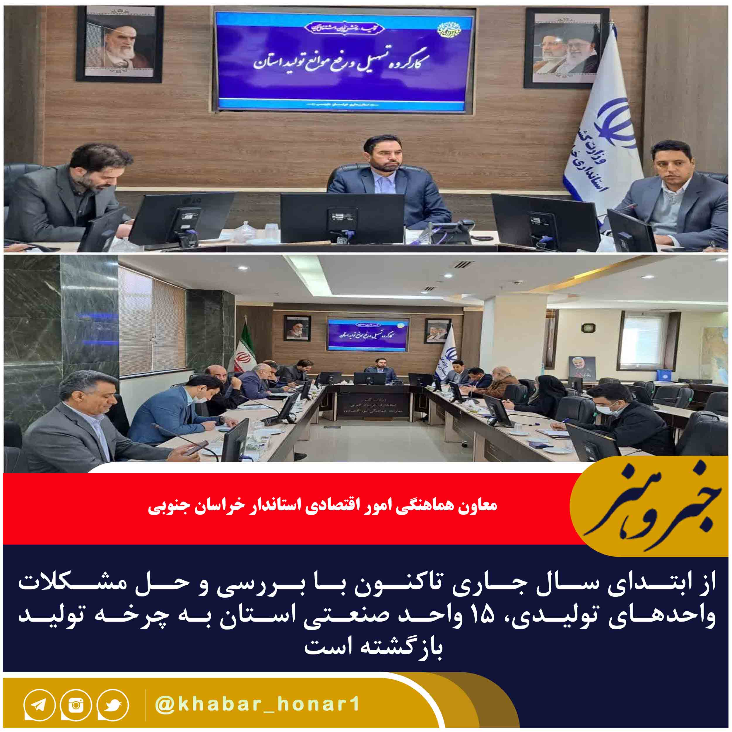 معاون هماهنگی امور اقتصادی استاندار خراسان جنوبی گفت: از ابتدای سال جاری تاکنون با بررسی و حل مشکلات واحدهای تولیدی، ۱۵ واحد صنعتی استان به چرخه تولید بازگشته است.