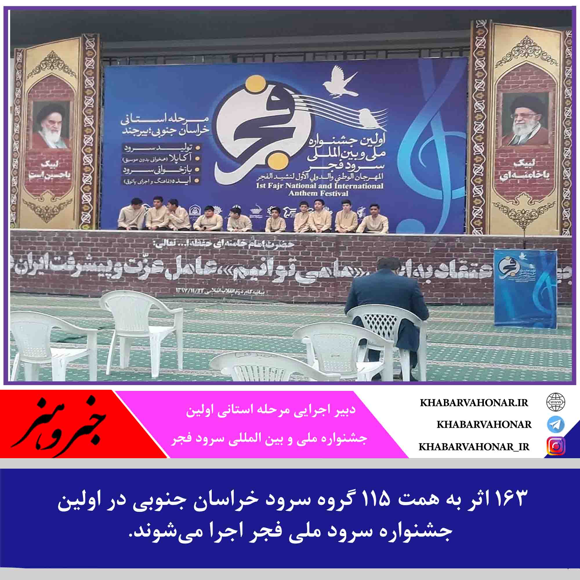 دبیر اجرایی مرحله استانی اولین جشنواره ملی و بین المللی سرود فجر گفت: ۱۶۳ اثر به همت ۱۱۵ گروه سرود خراسان جنوبی در اولین جشنواره سرود ملی فجر اجرا میشوند.